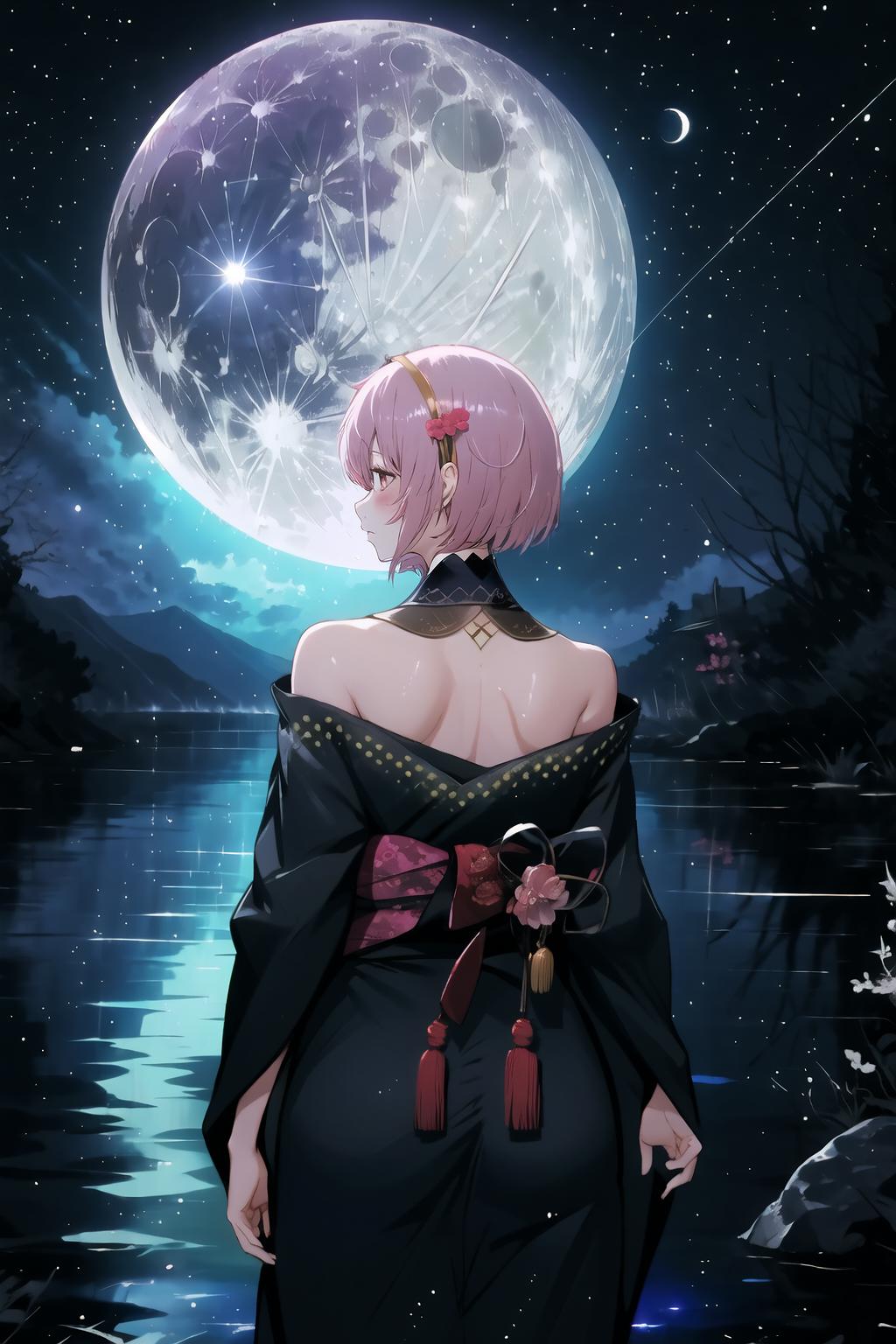 MoriNewYears, short hair, detached collar, black kimono, shoulders, sash