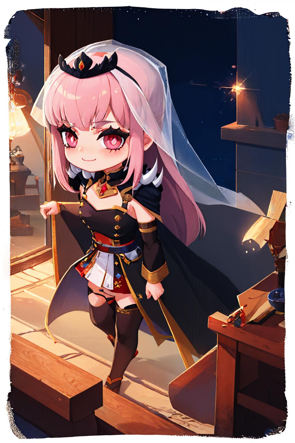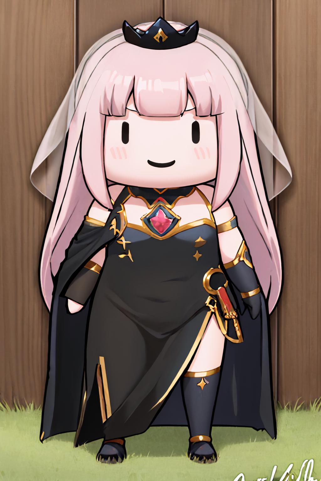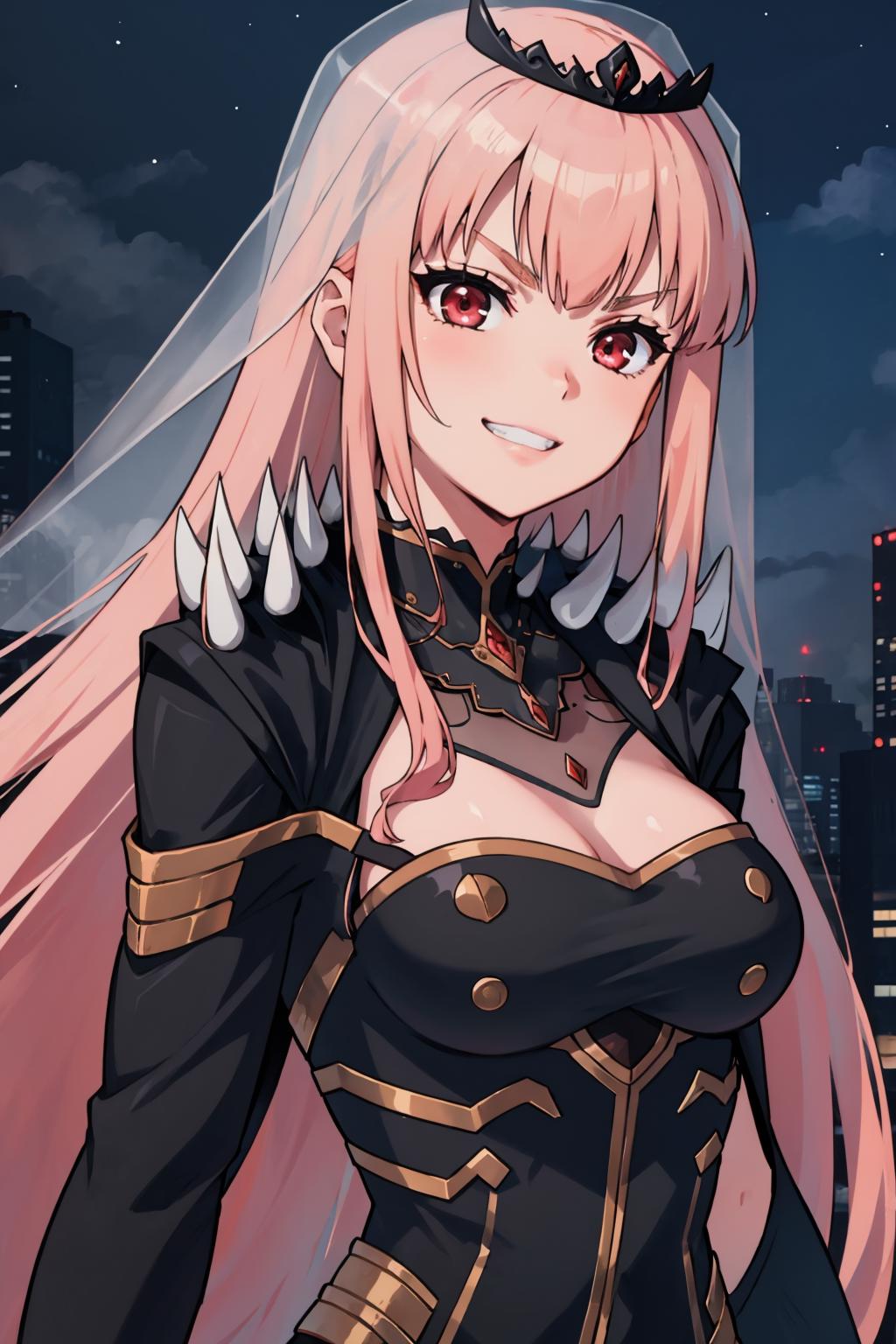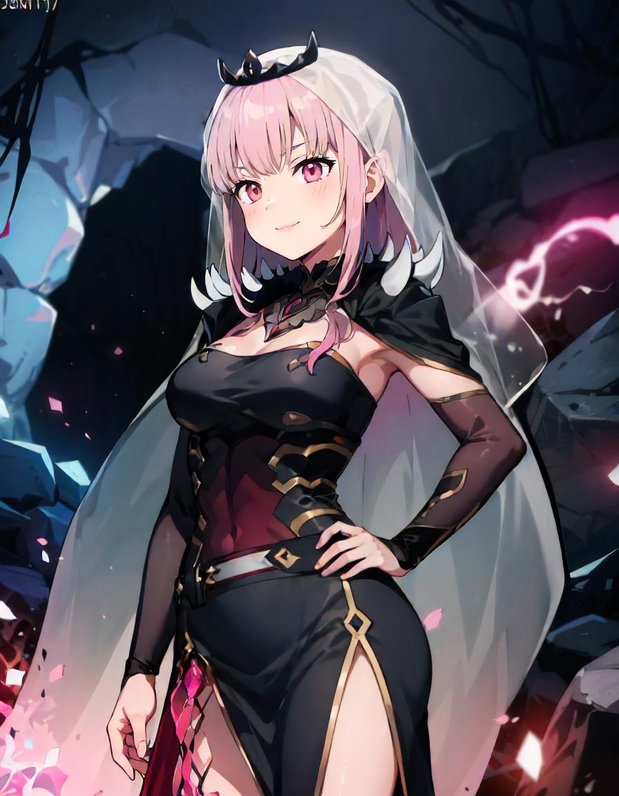 MoriBase, long hair, veil, tiara, long black sleeveless dress, side slit, torn black cape, shoulder spikes, single black thighhigh, detached sleeves, sleeve