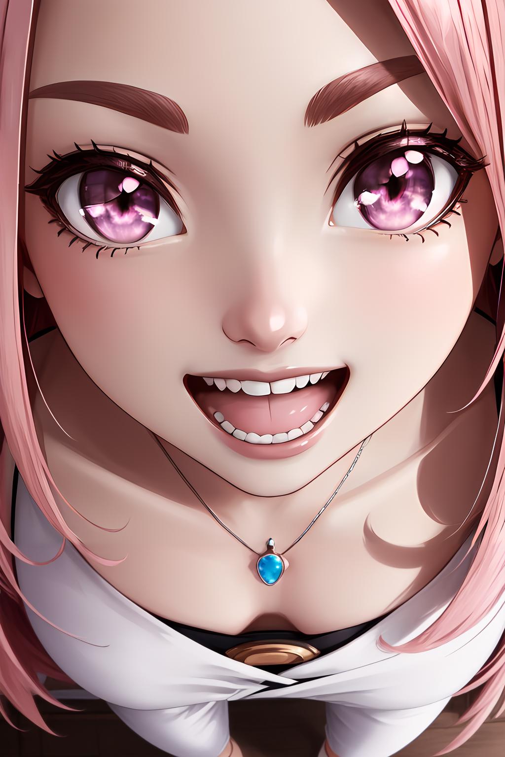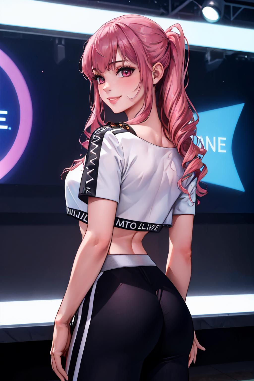 MoriStreetwear, long hair, ponytail, necklace, hoop earrings, white halter shirt, sleeveless, skull print, midriff, track pants