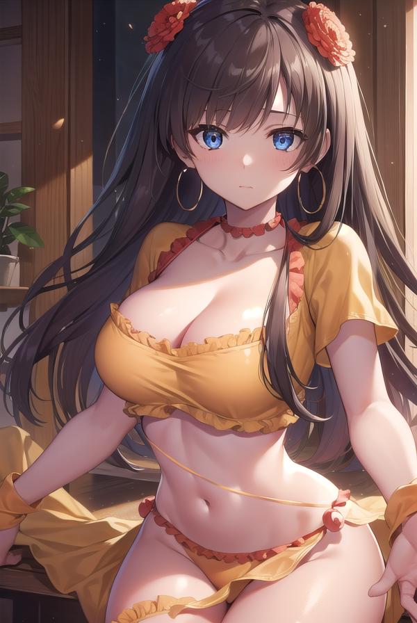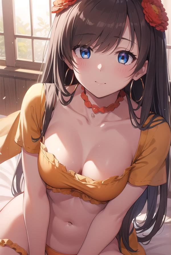 bridal garter, crop top, dancer, earrings, flower, frills, hoop earrings, jewelry, midriff, navel, orange panties, orange shirt, panties, red flower, revealing clothes, shawl, shirt, short sleeves, underwear,