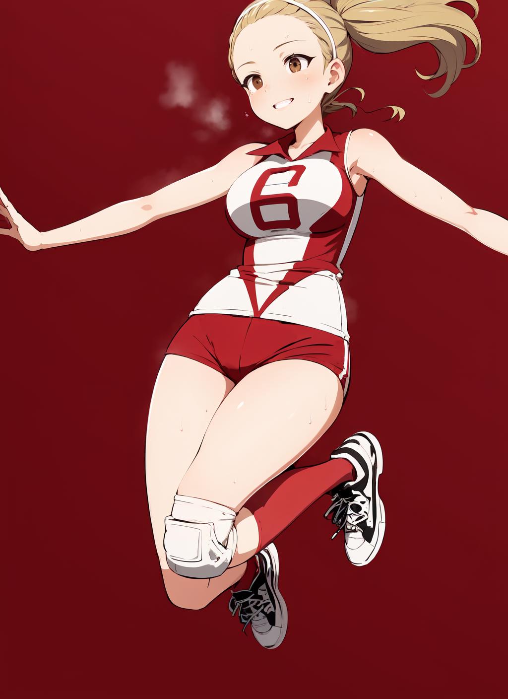 hairband, volleyball uniform, sleeveless shirt, shorts, red socks, sneakers
