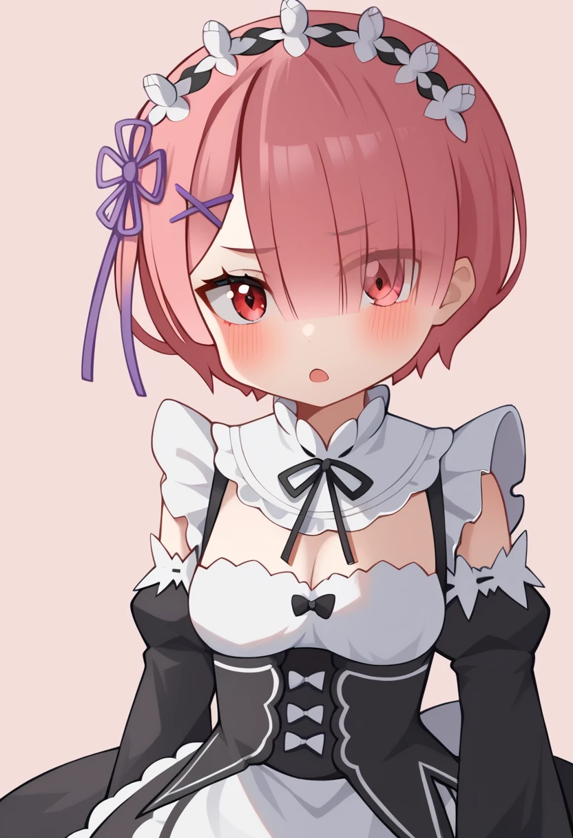 keyword:1girl,roswaal_mansion_maid_uniform,solo,short_hair,ribbon,hair_ornament,detached_sleeves,ram_\(re:zero\),pink_hair,maid,x_hair_ornament,breasts,、