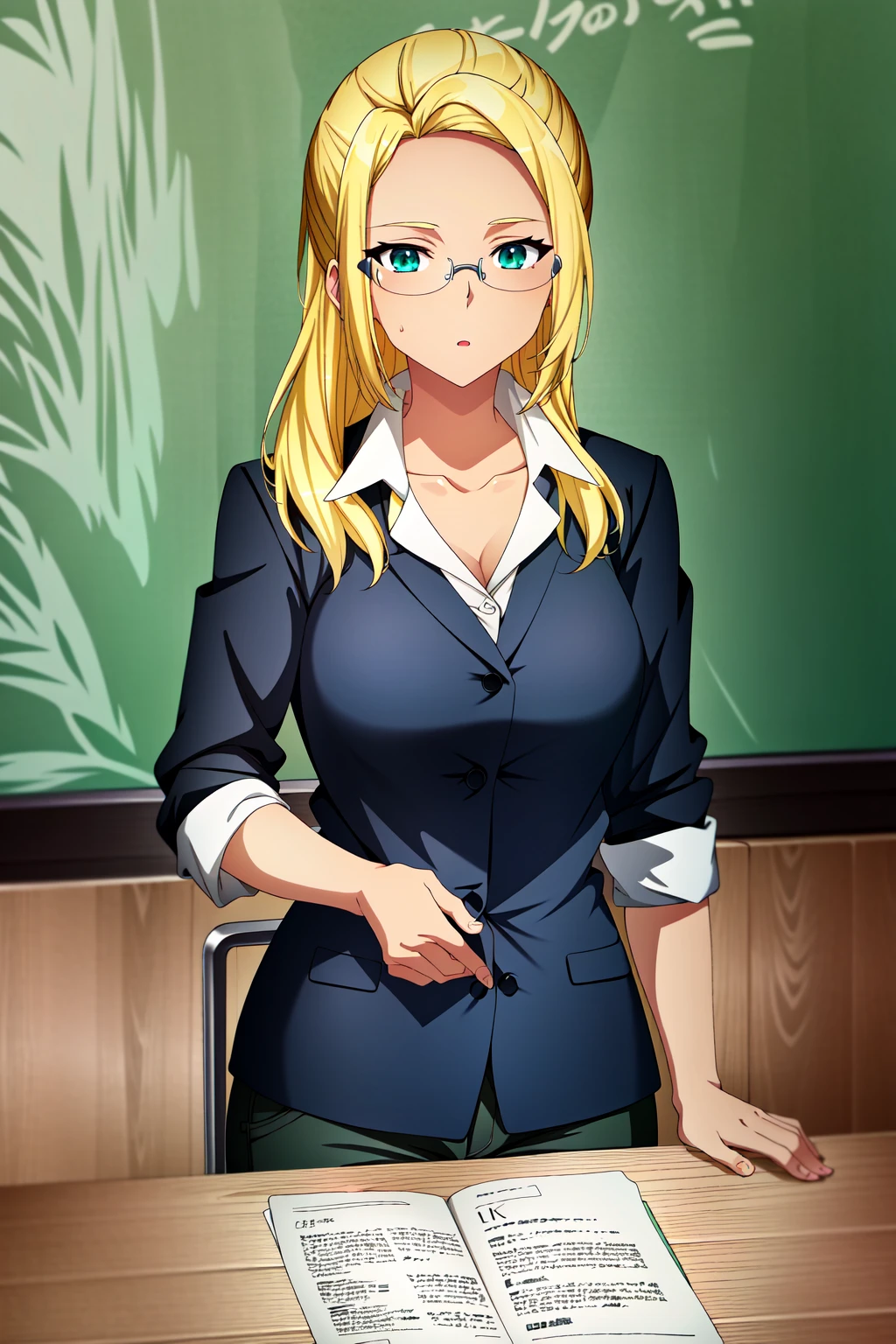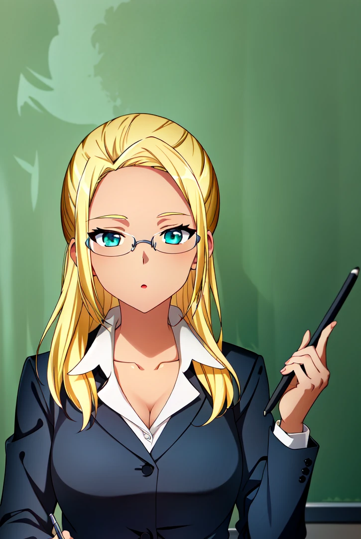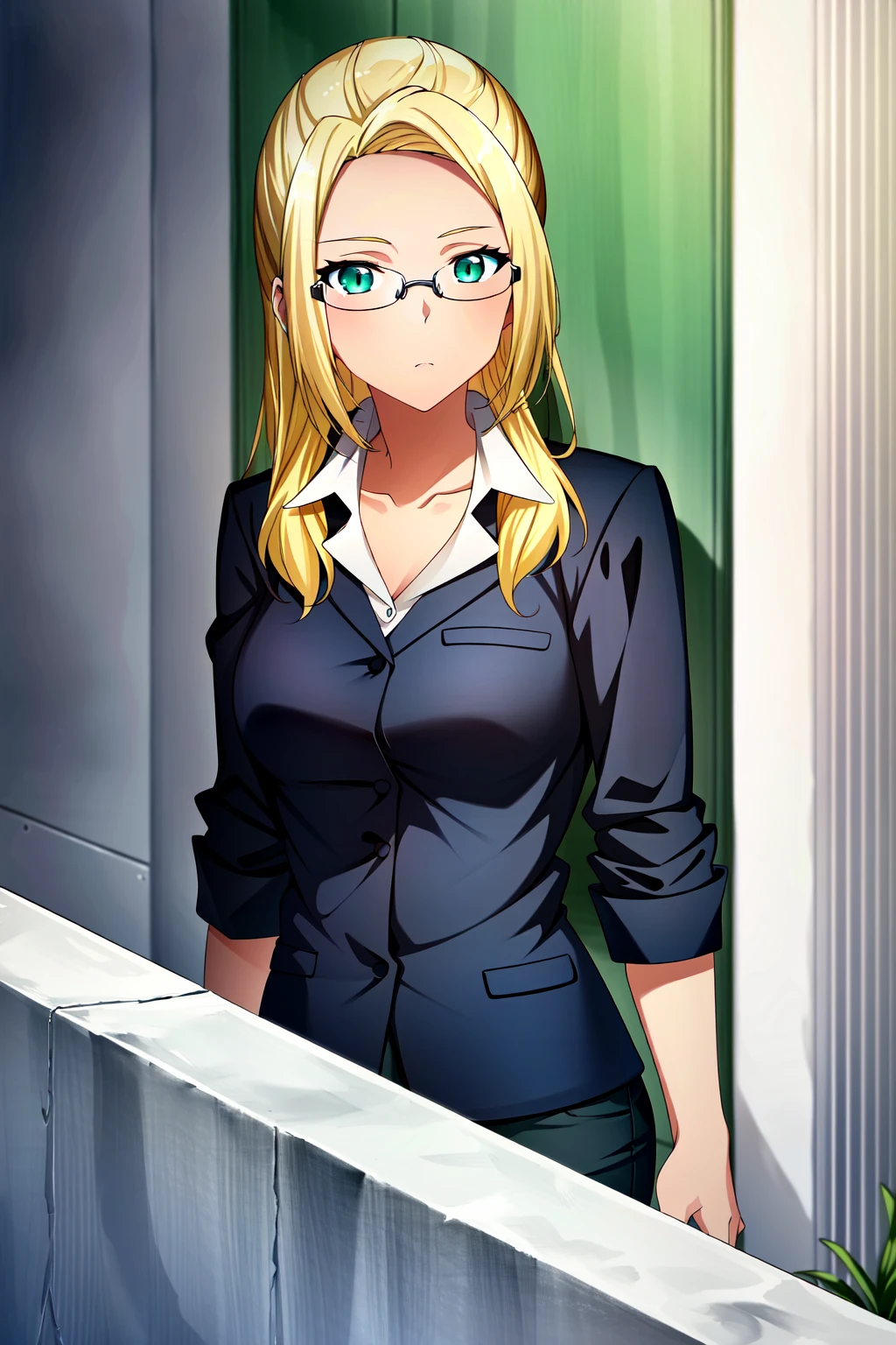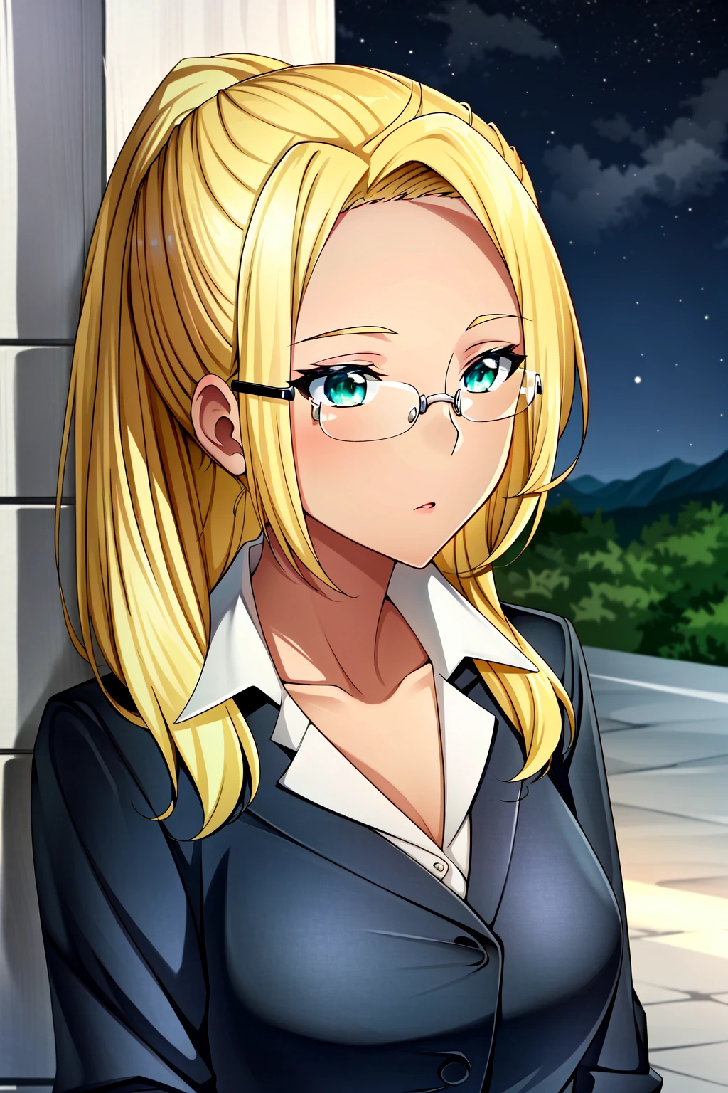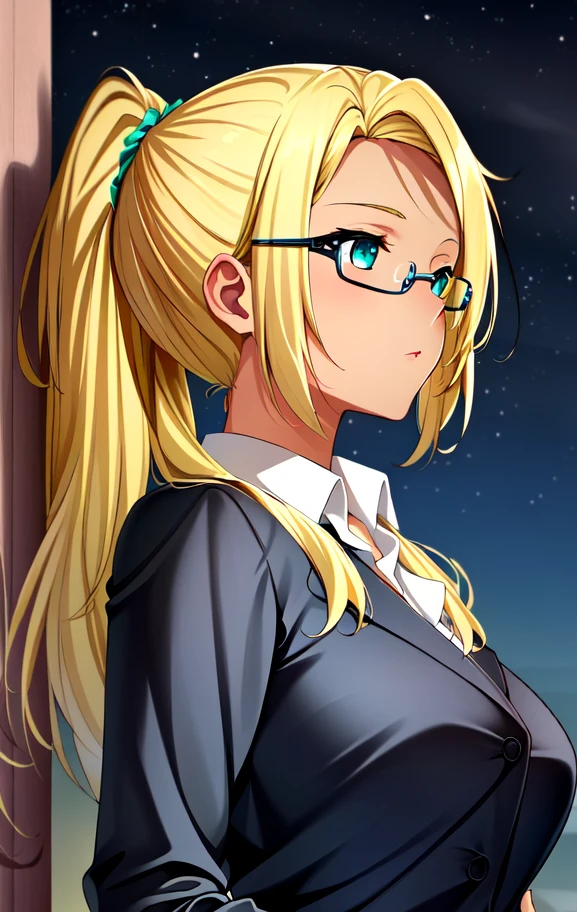 Ashe, 1girl, solo, blonde hair, skirt suit, dark-skinned female, glasses, pantyhose, formal, dark skin, suit, skirt, pencil skirt, long hair, office lady, ponytail