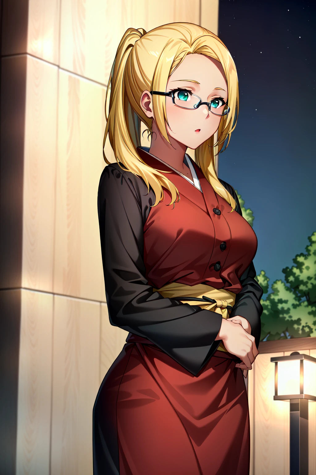 Ashe, blonde hair, glasses, long hair, ponytail, dark skin, green eyes, dark-skinned female