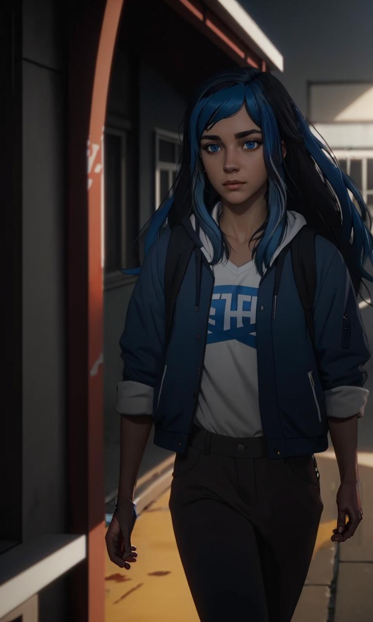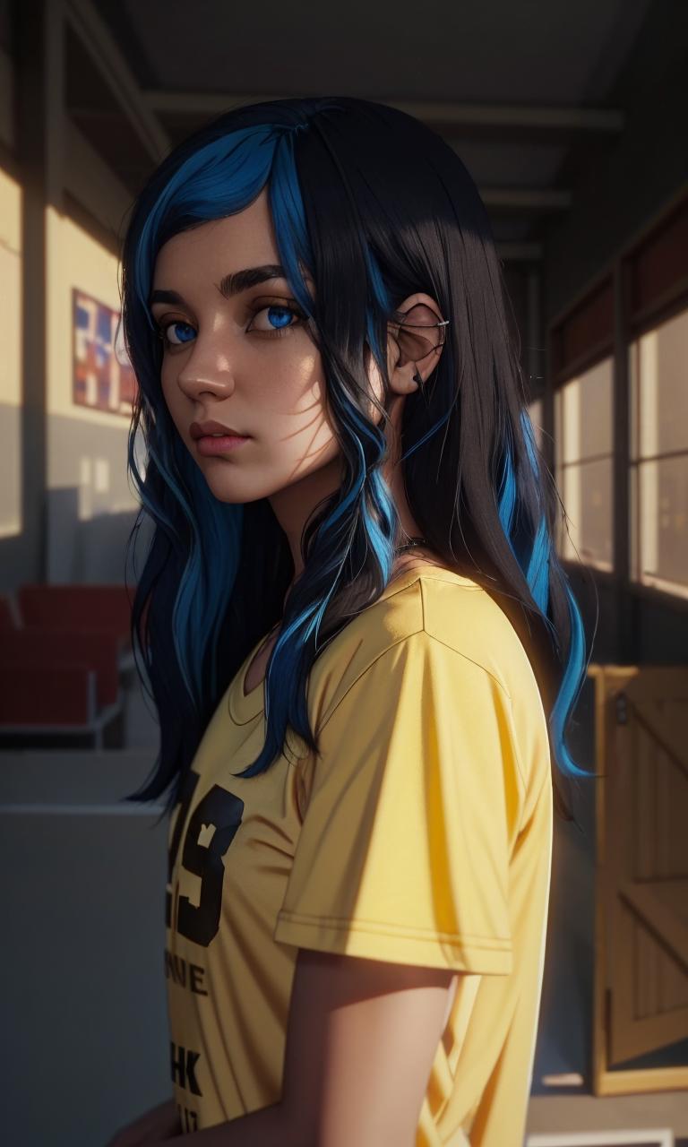 You want to add brown skin, blue eyes, black hair, blue hair streak in the prompts.