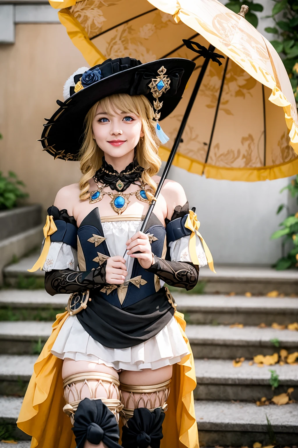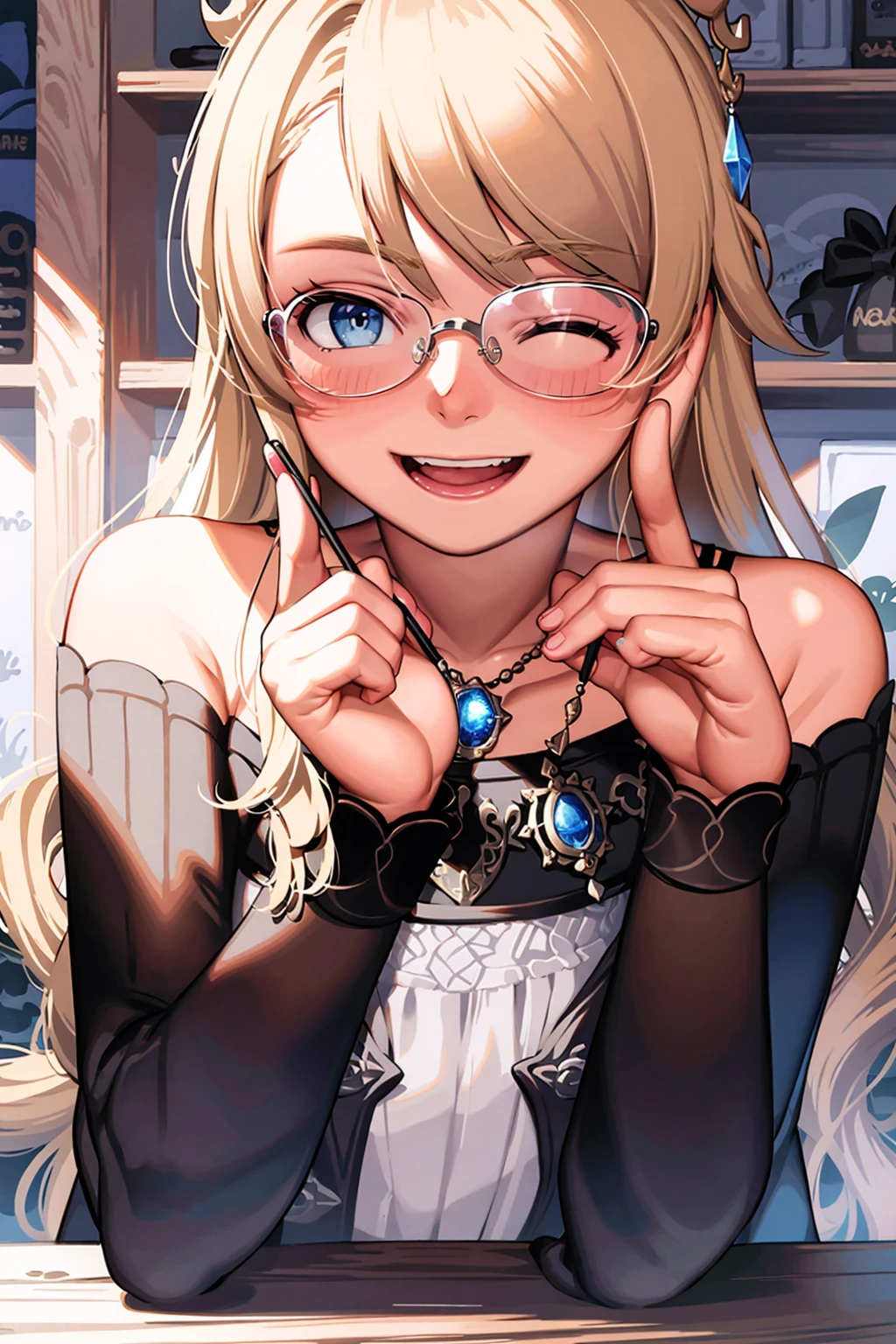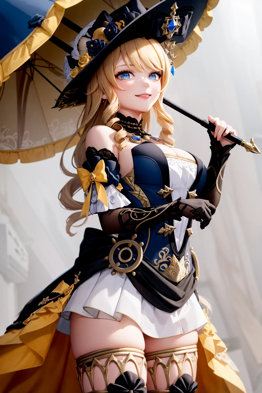 1girl, hat,blonde hair, long hair, drill hair, twin drills,blue eyes, jewelry, flower, ???? shoulders, black gloves,dress, thighhighs, thigh boots, boots,