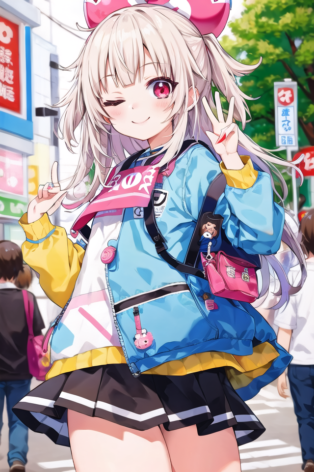 ウィンクがうまく出ない場合は、まずプロンプトの強度を(one eye closed, wink:1.3)のように上げてみて、それでもうまくいかない場合はLoRAの強度を上げてください。