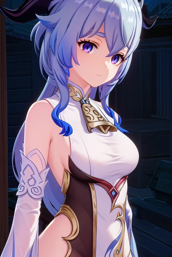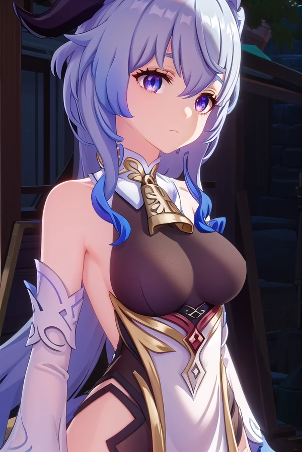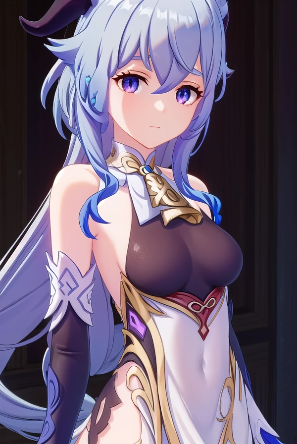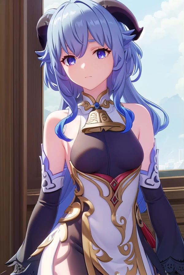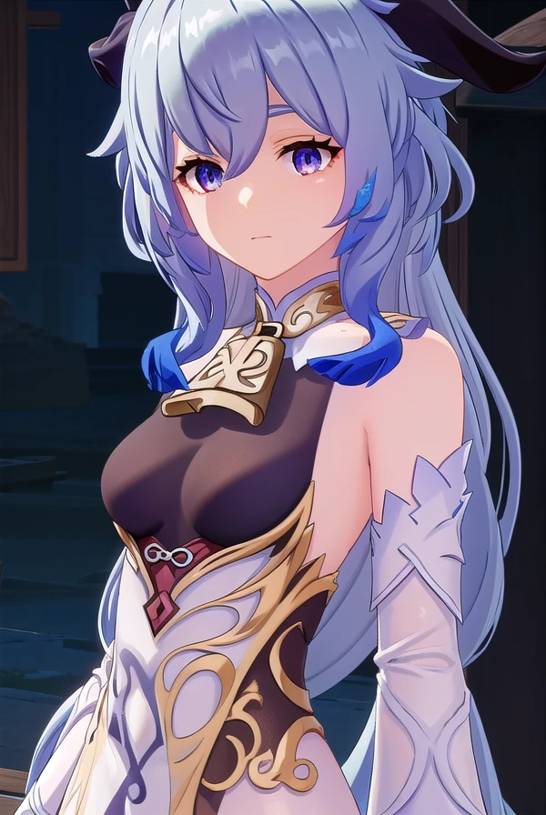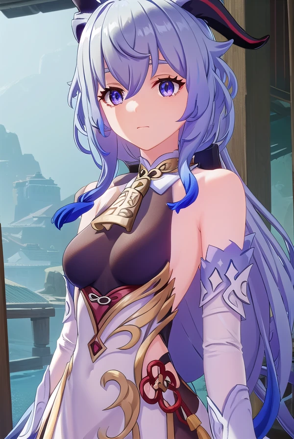 ganyu, blue hair, goat horns, horns, long hair, (purple eyes:1.1), sidelocks,