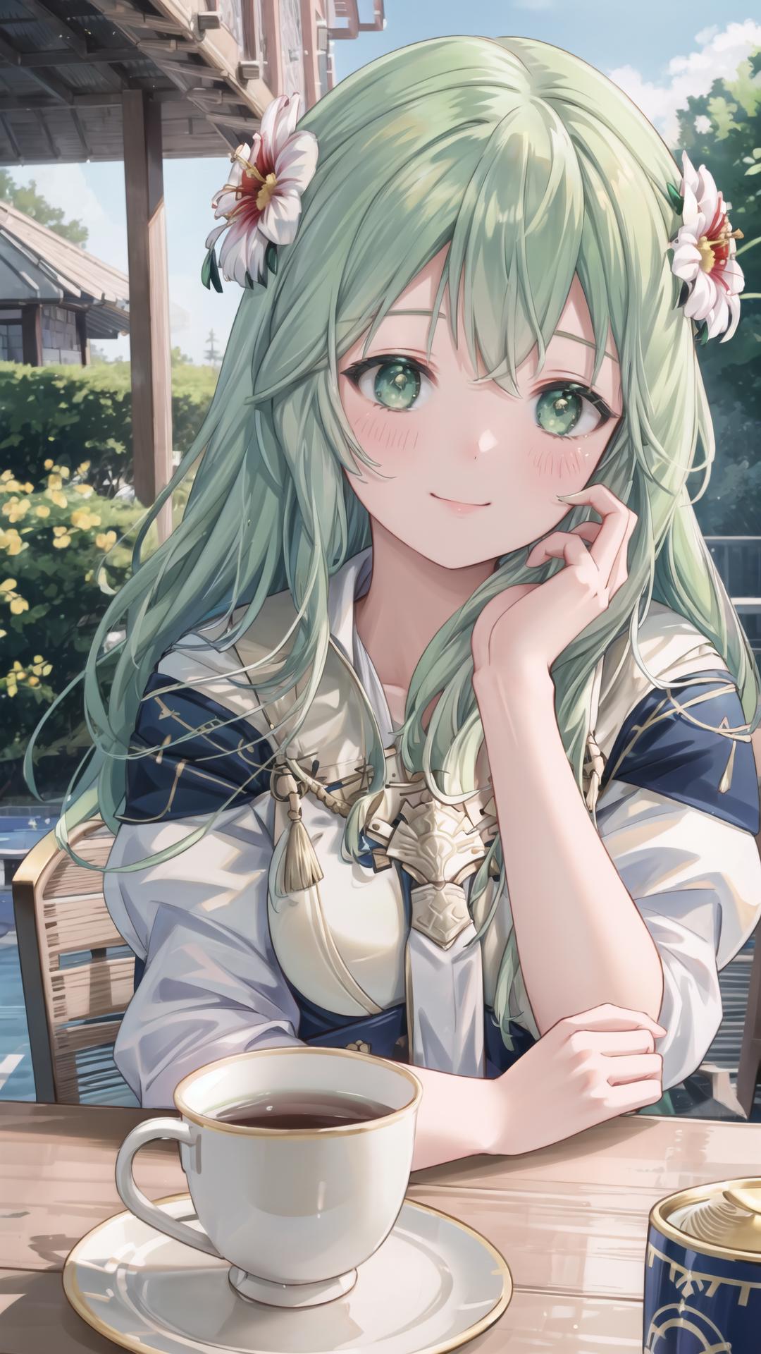 defRhea, headdress, hair flower, tiara, blue cape, long white dress