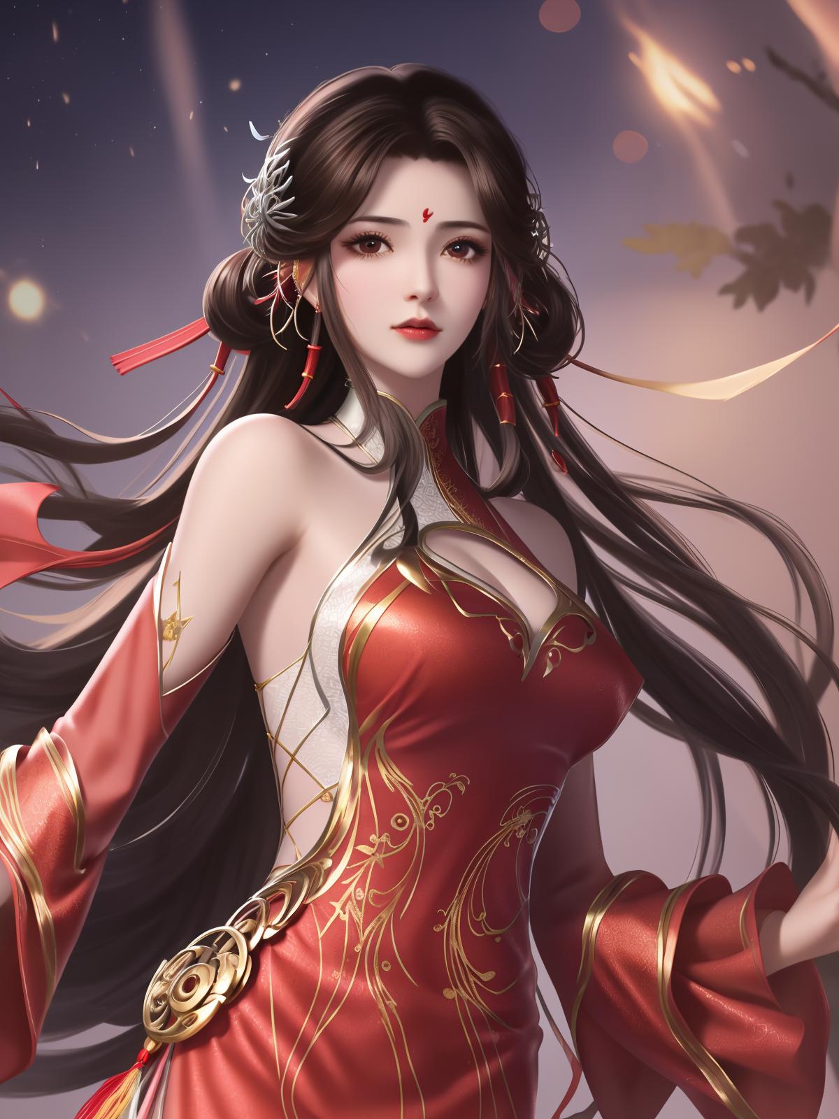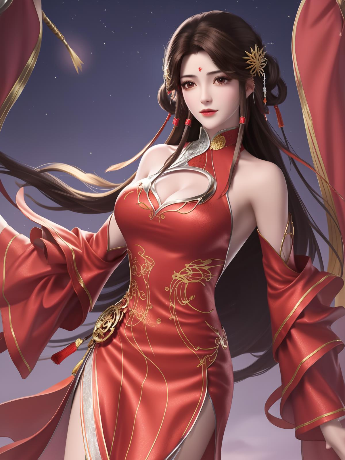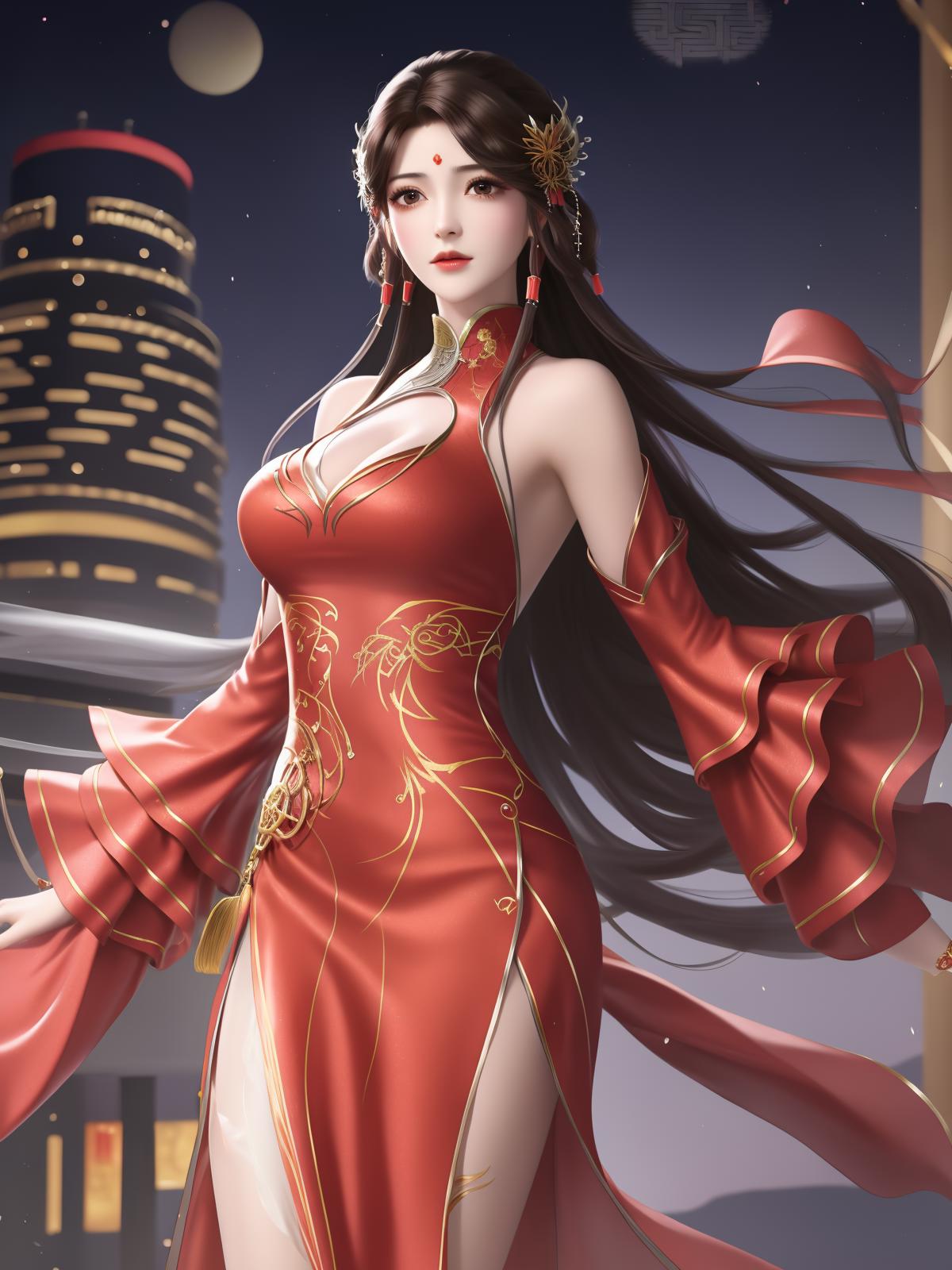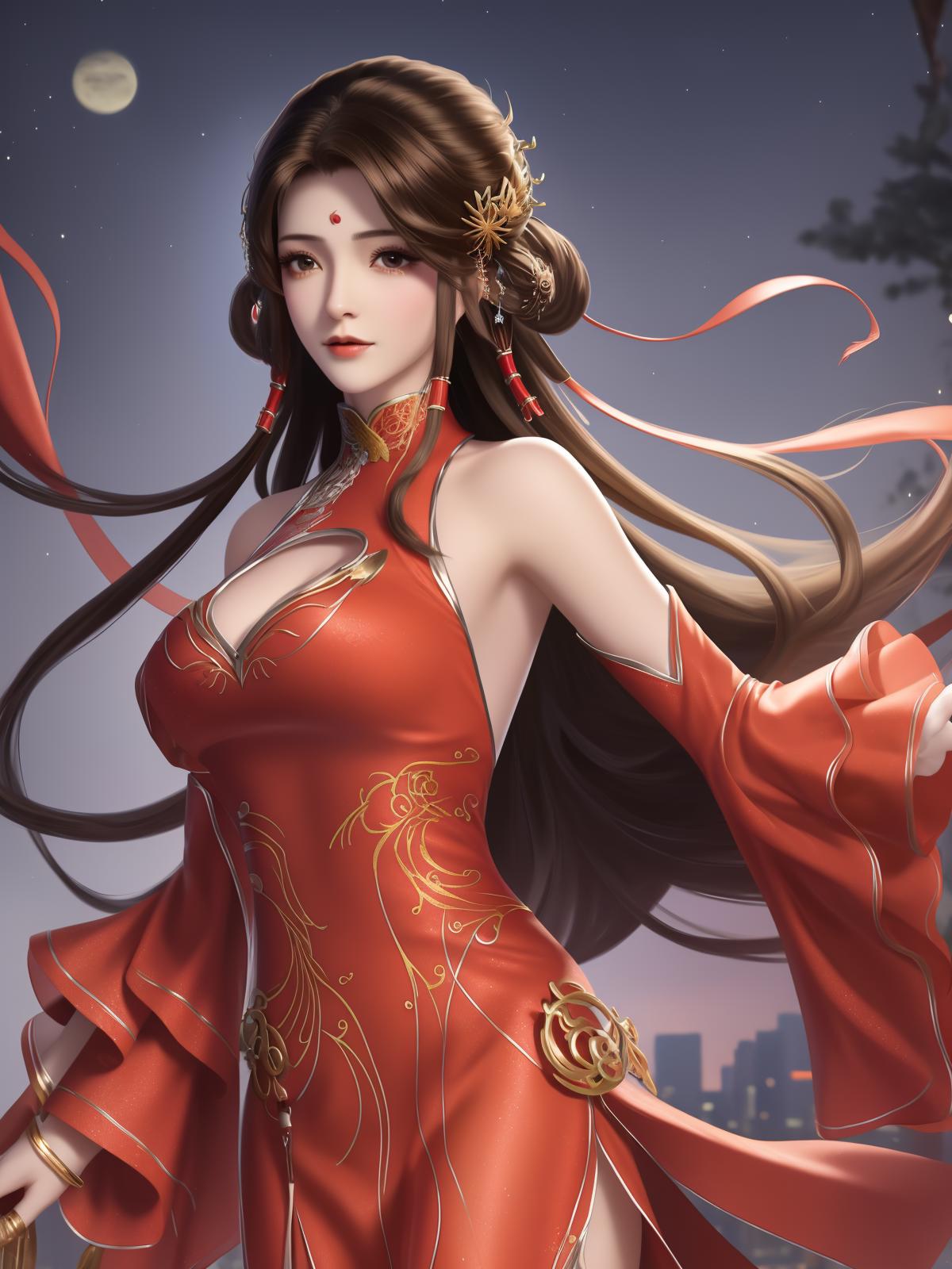 1girl,clothing cutout,dress,bare shoulders,chinese clothes, facial hair, forehead mark, hair ornament, long hair, jewelry, hair rings, cityscape, night, looking at viewer, mature female, brown hair, chinese clothes, see-through,trim, cowboy shot,