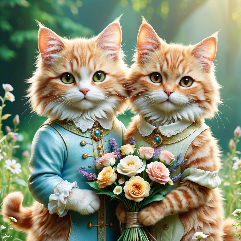 An image of two cats holding a bouquet of flowers will be generated. 예상 비용: 2개 조각에 대해 16<브르>꽃다발을 들고 있는 2마리의 고양이 이미지가 생성됩니다。추정 비용 2장에 대해 16<브르>자동 번역