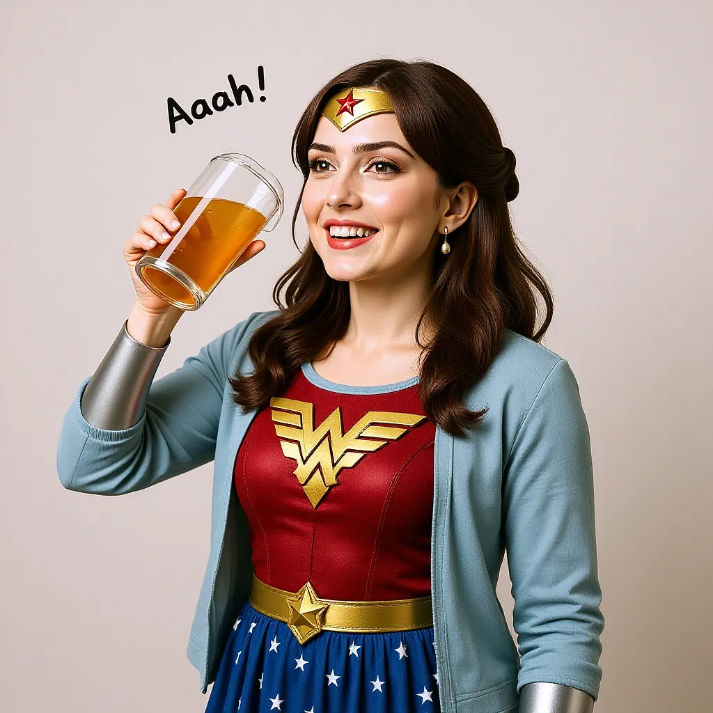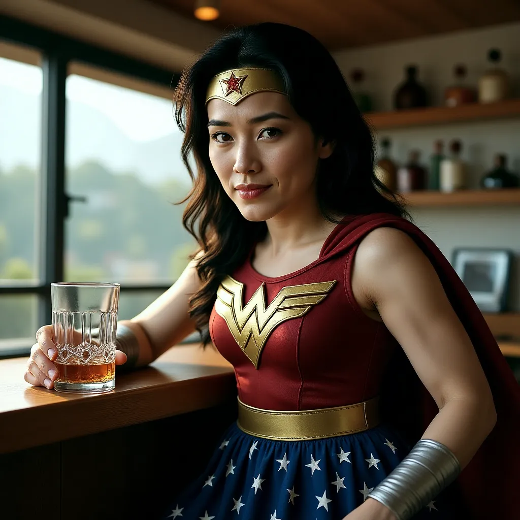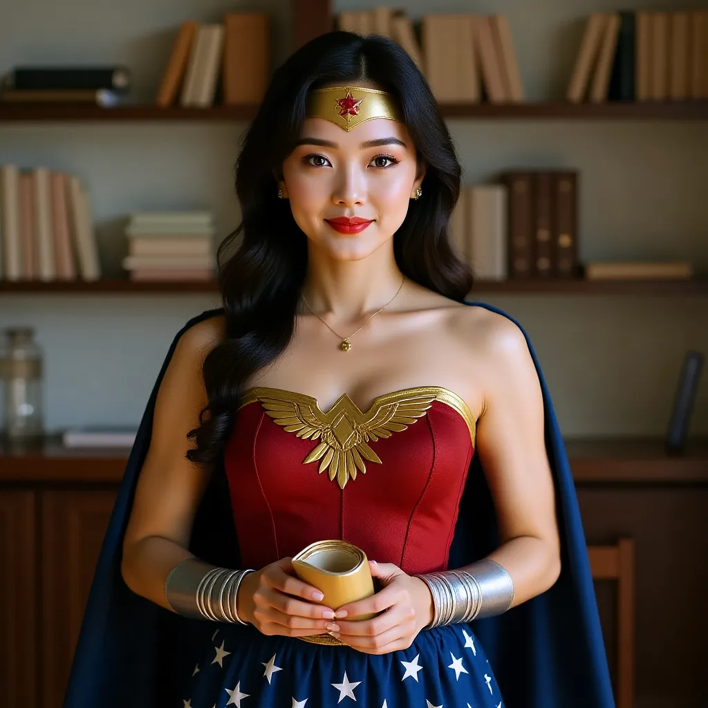이미지의 여성이 원더우먼으로 변신합니다。메이크업과 얼굴이 약간 진해집니다。변신 과정의 동영상과 변신 후 기념 촬영이 포함됩니다
