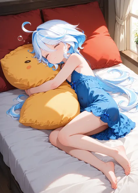 基于Illustrious模型生成잠옷Frunina。요소:Frunina、Teddy bear plush、침대、속옷,잠옷。