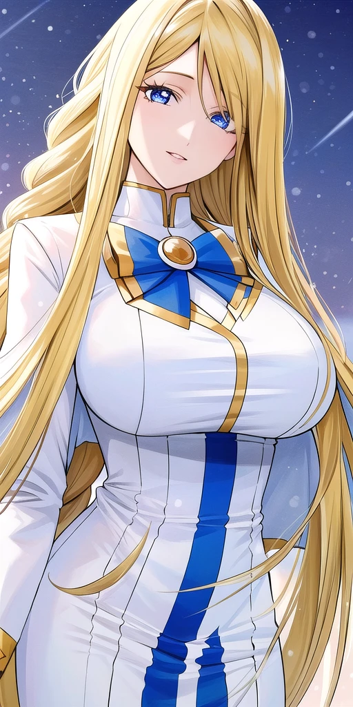 Winter_aria_company_uniform_White_long_dress_White_capelet_Blue_bowtie_Long_sleeves_high_collar_Side_slit: Winter variation of the aria company uniform.