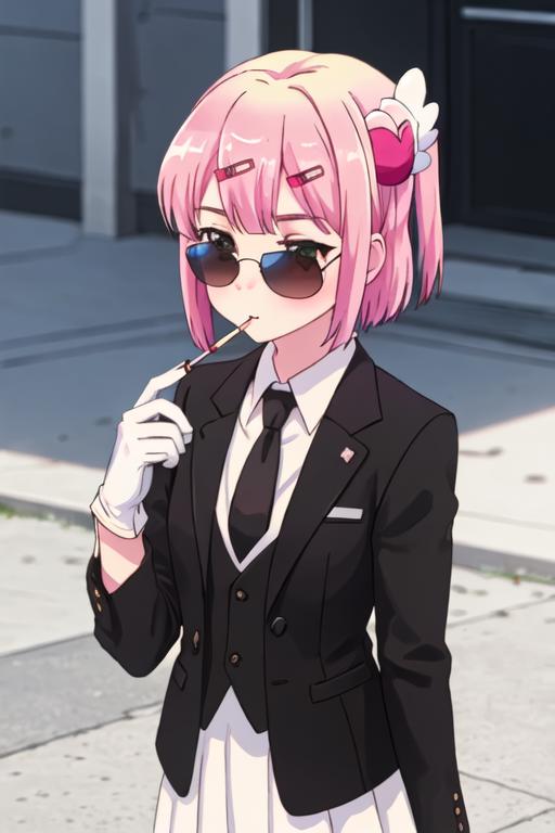 pink_hair, short_hair, hair_ornament, blush, hairclip, closed_mouth, bangs, shiny_hair, green_eyes