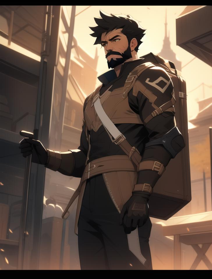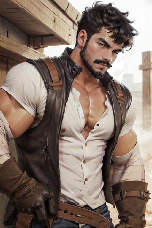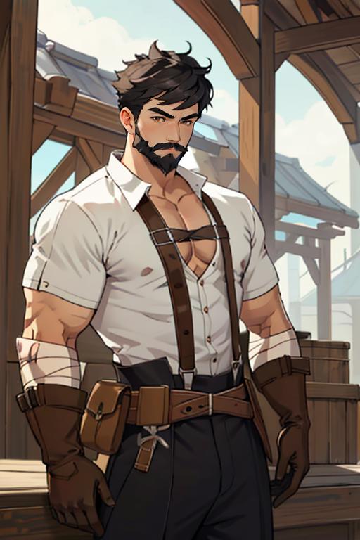 Tags: Wagner_Genshin_Impact, solo, short hair, black hair, 1boy, brown eyes, white shirt, male focus, muscular, facial hair, bandages, pectorals, muscular male, bara, beard, brown gloves, mustache, leather.