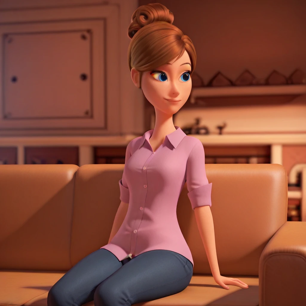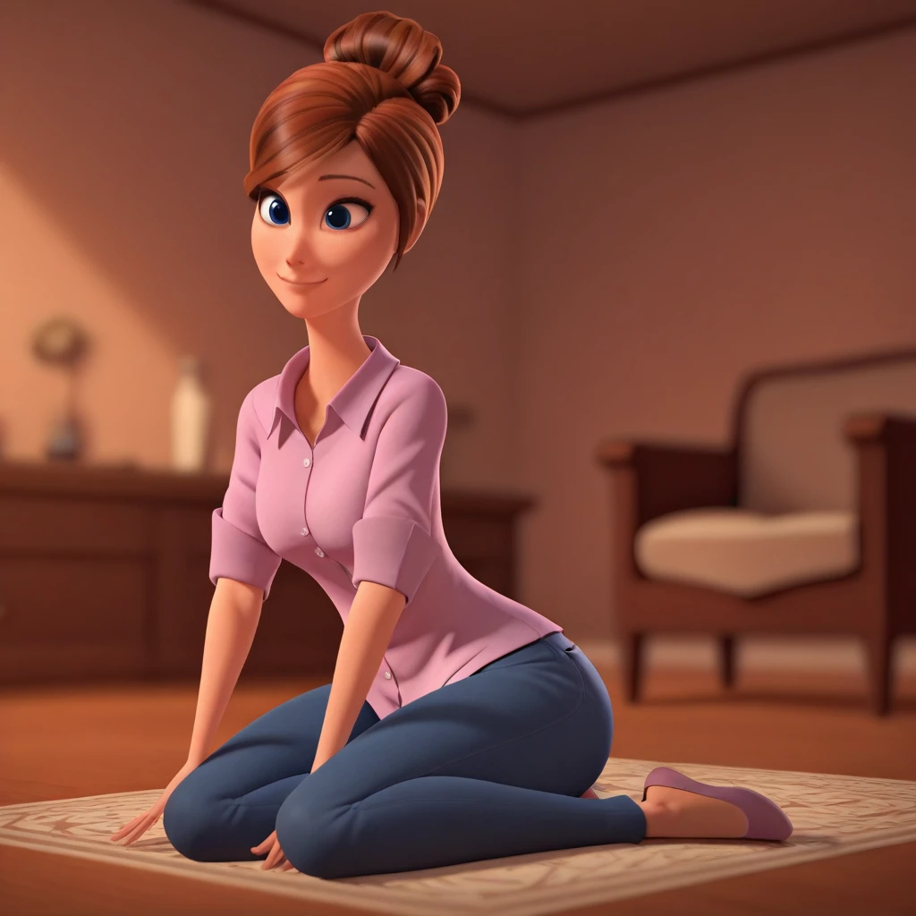 1girl, solo, brown hair, single hair bun, blue eyes,