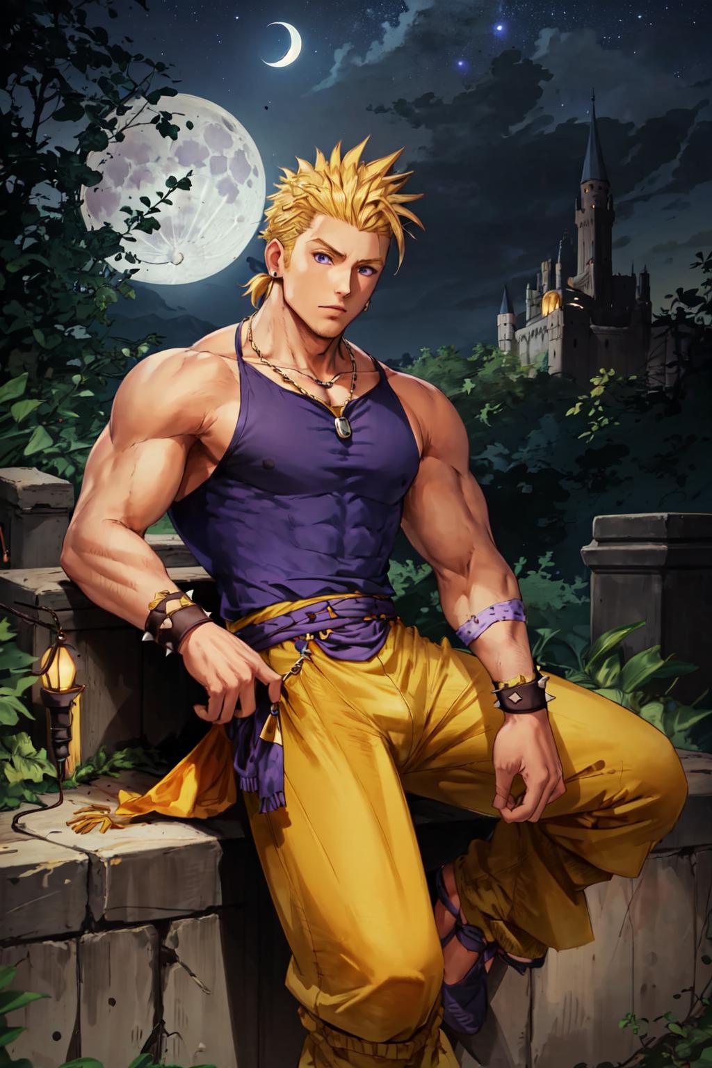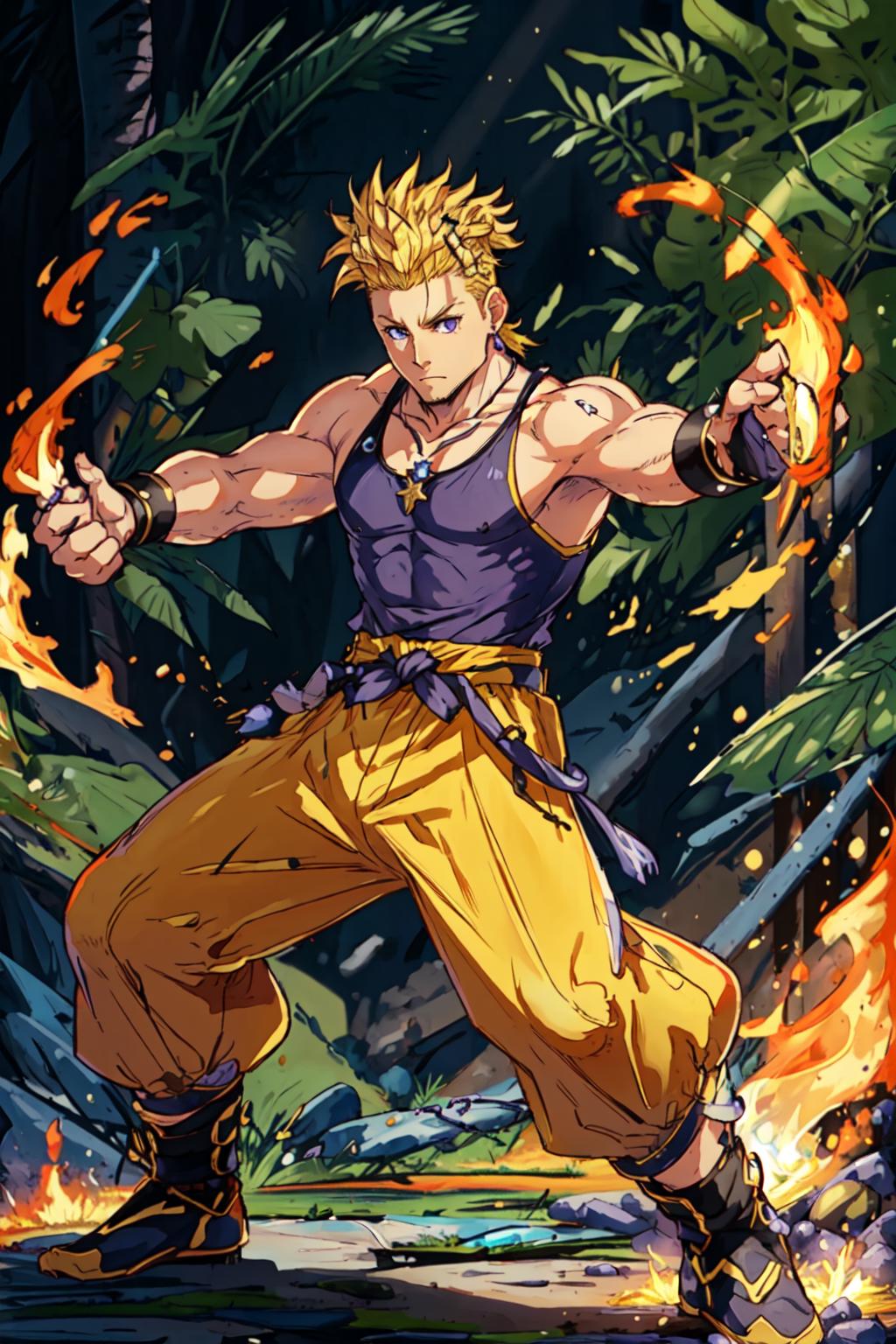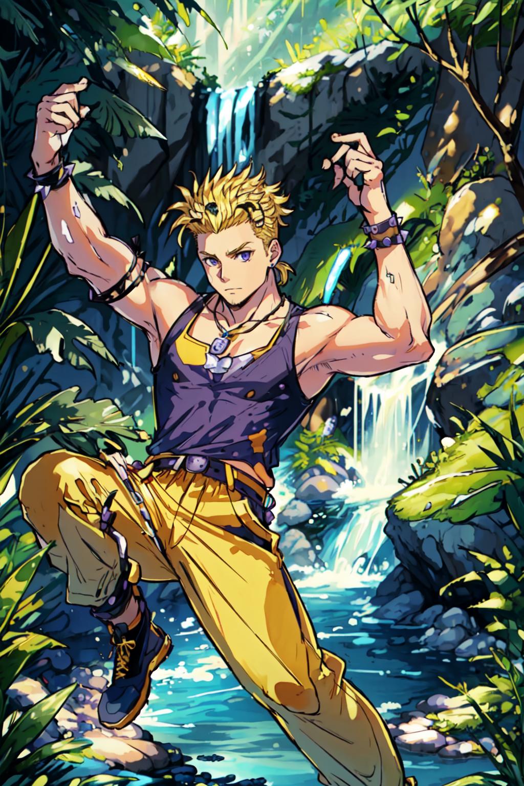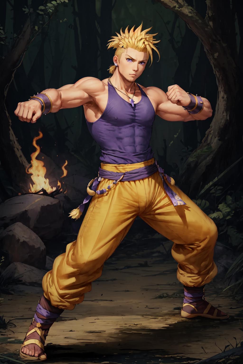 yellow pants, purple muscle shirt,blonde hair, spiked hair, wristband, necklace