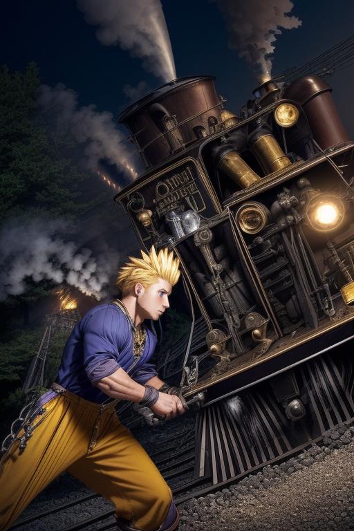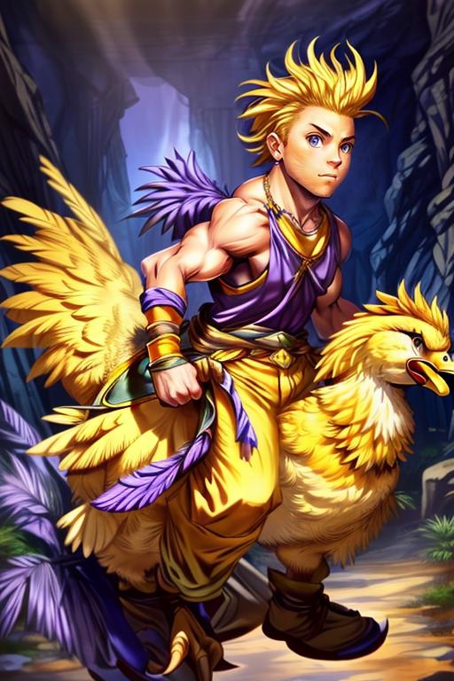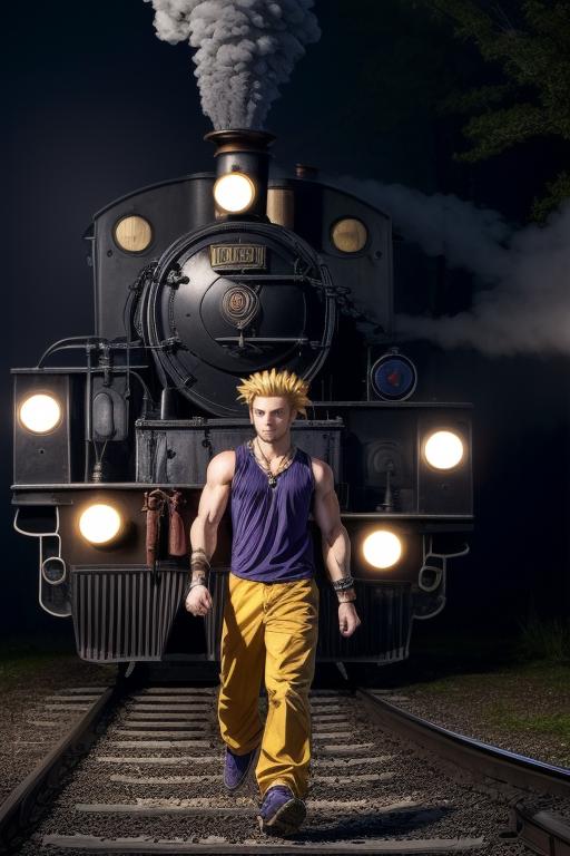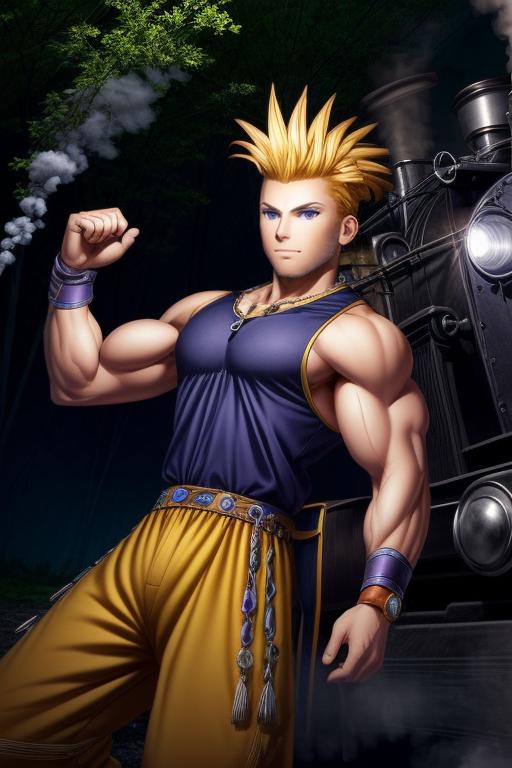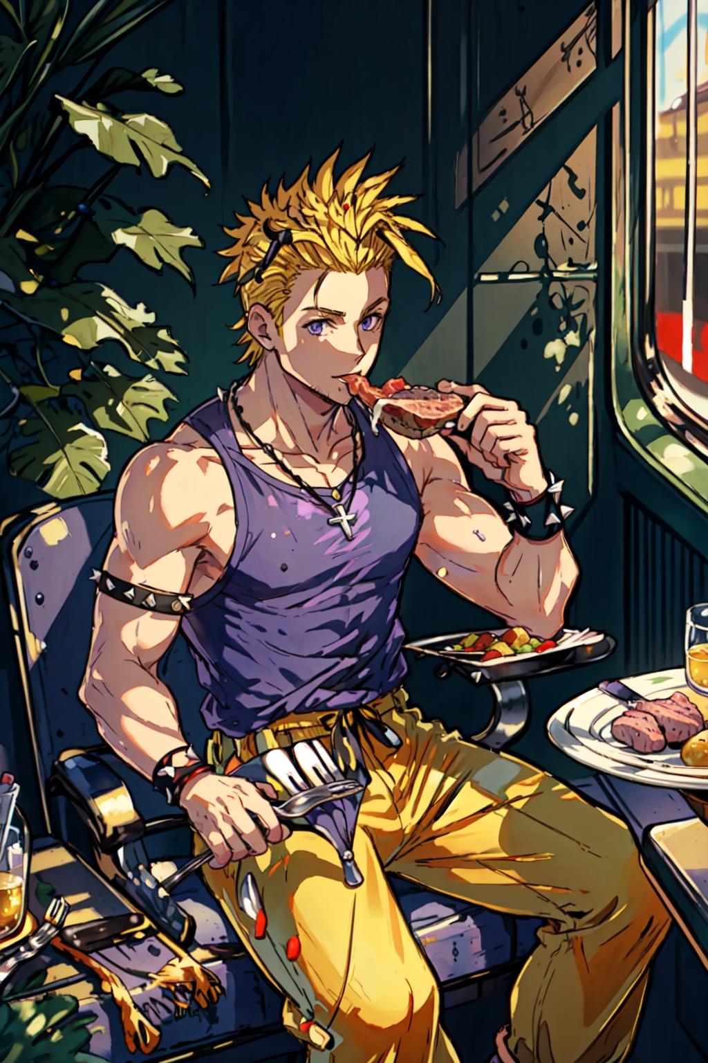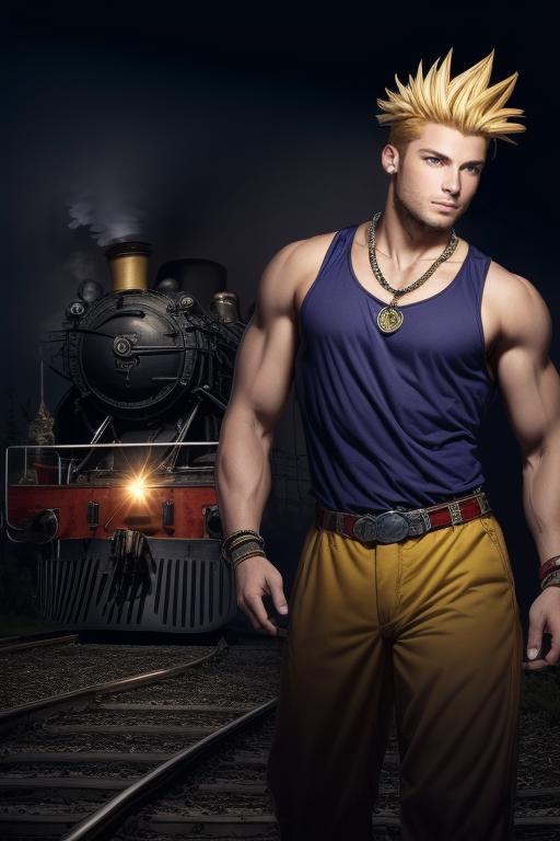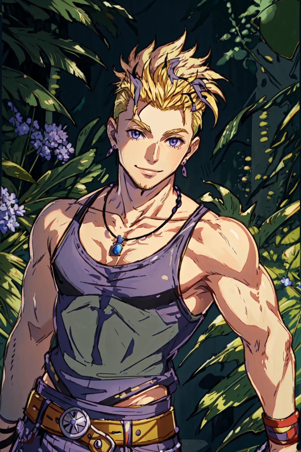 yellow pants, purple muscle shirt,blonde hair, spiked hair, wristband, necklace
