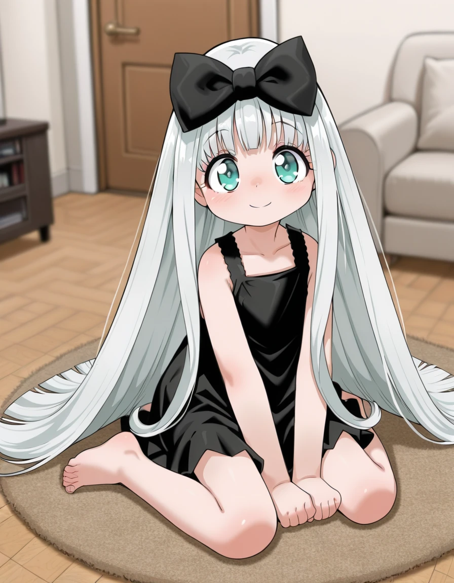 granite, child, long hair, green eyes, silver hair, very long hair, blunt bangs,hair ribbon, aqua eyes, dress, hair bow, skirt,ankle boots, sleeveless, black dress, , sleeveless dress, bow on boots