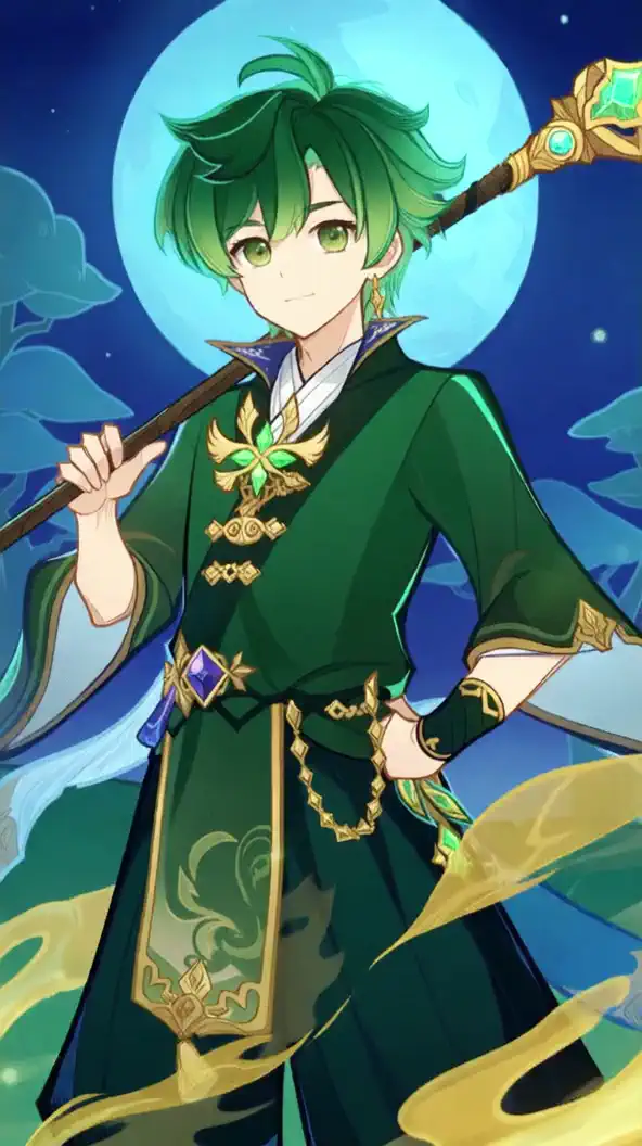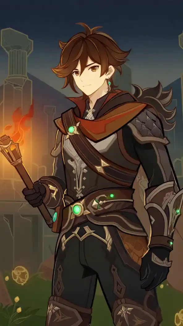 "Genshin_TCG medium shot" + character description (appearance, pose, clothing) + key object (weapon/artifact) + background + dynamic elements. Special attention is paid to color contrasts (dark armor vs glowing accents) and mystical atmosphere (starry sky, magical particles).If you want to add a gold frame like in the TGC cards, add this to the end of the prompt: