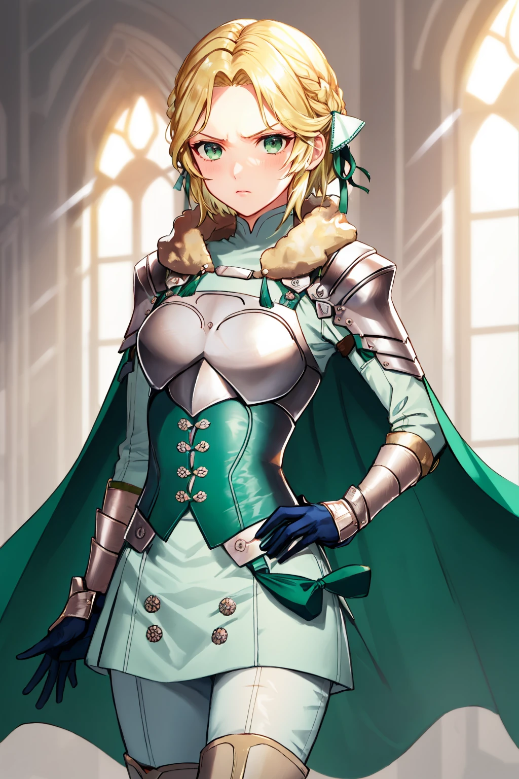 Add "warIngrid, short hair, hair ribbons, shoulder armor, armor, breastplate, underbust, green coat, fur trim, vambraces, blue gloves, green cape, green skirt, white pants" for her timeskip look.