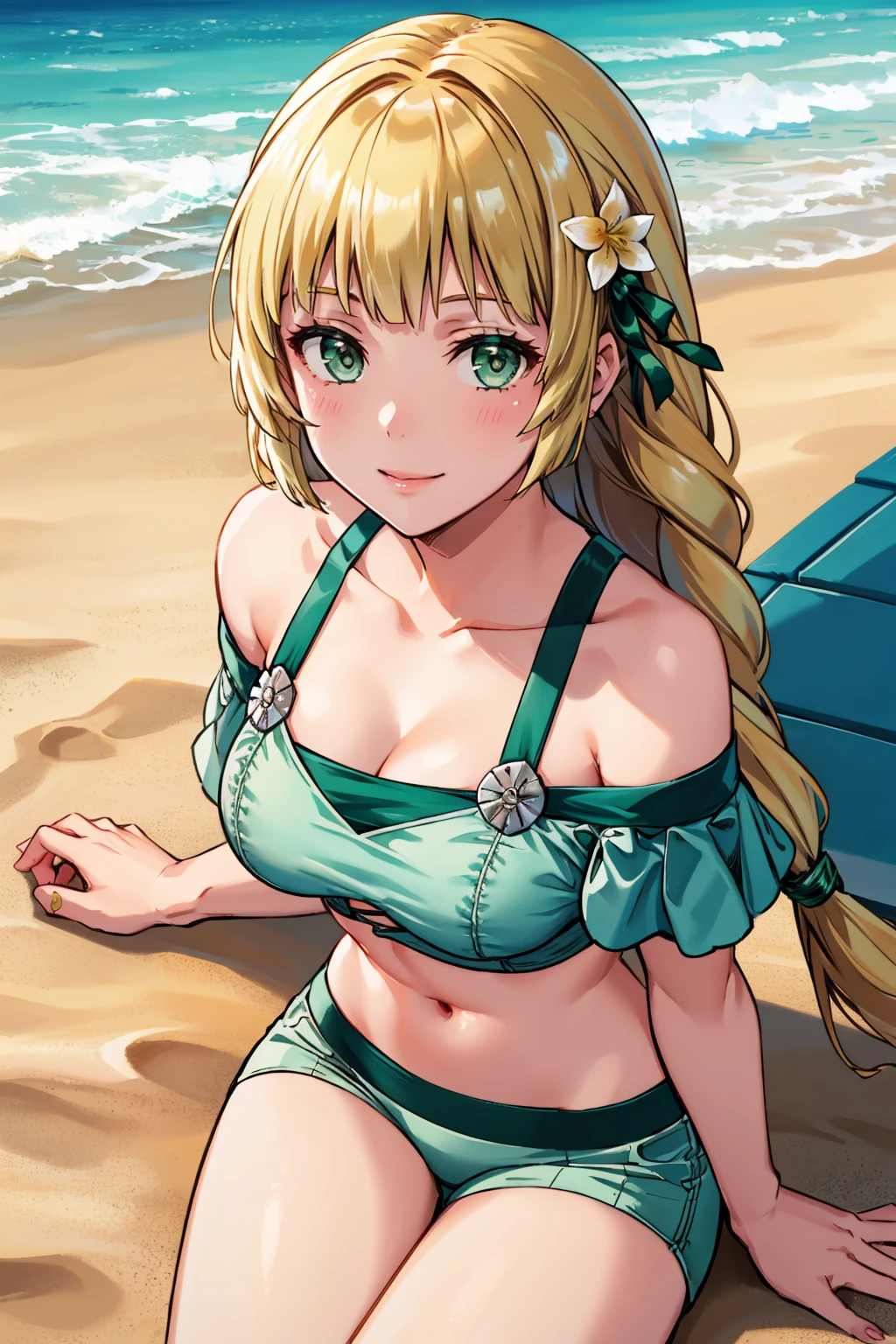 Add "sumIngrid, bangs, hair flower, hair ornament, braided ponytail, cleavage, green ??????, off-shoulder, green shorts, green bow" for Summer Ingrid.