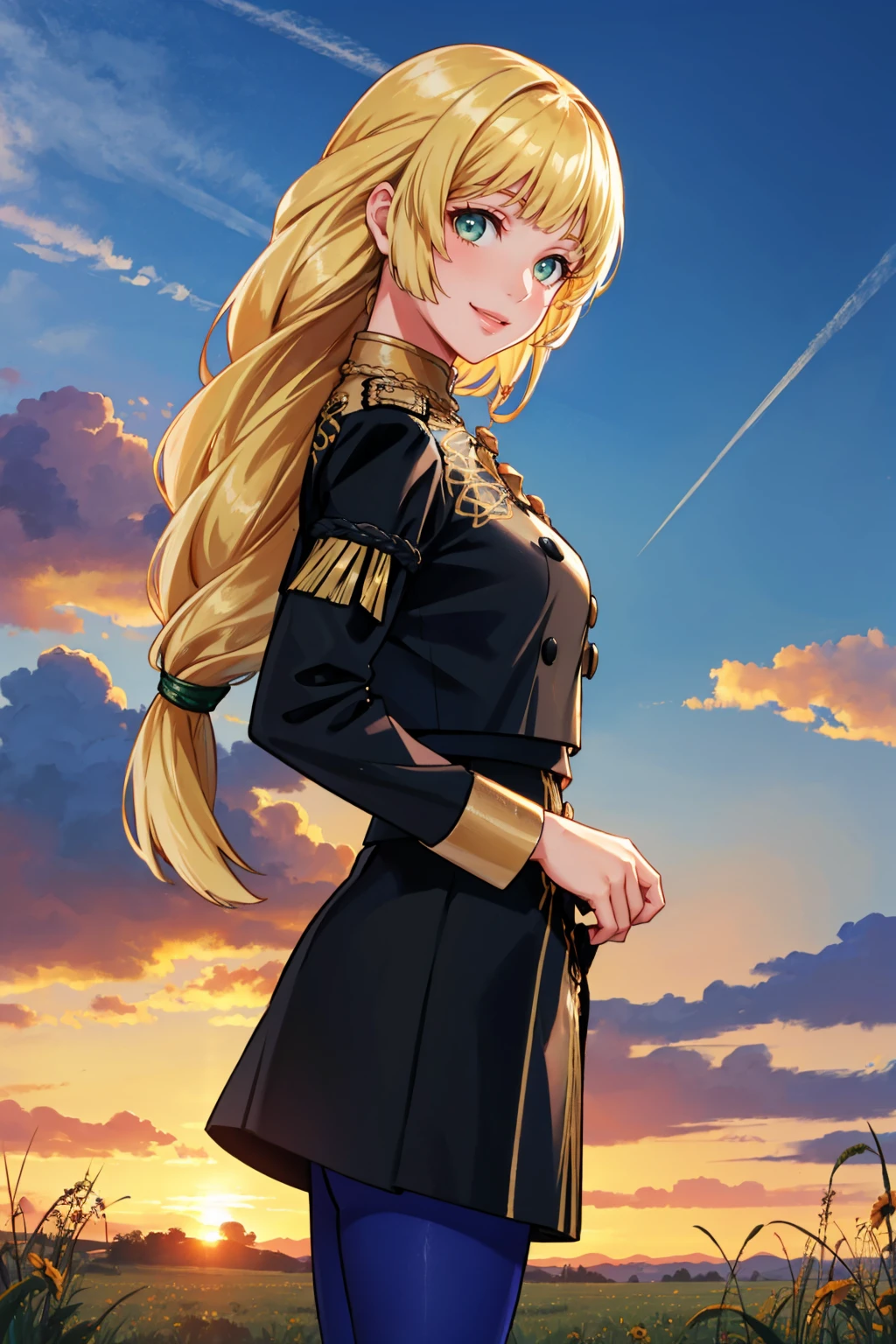 Add "defIngrid, bangs, braided ponytail, black jacket, black skirt, blue pantyhose" for her academy look.