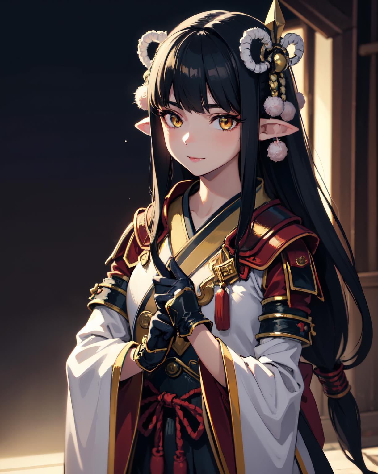 long hair, bangs, gloves, long sleeves, black gloves, wide sleeves, partially fingerless gloves, white kimono, wagashi, yellow eyes,