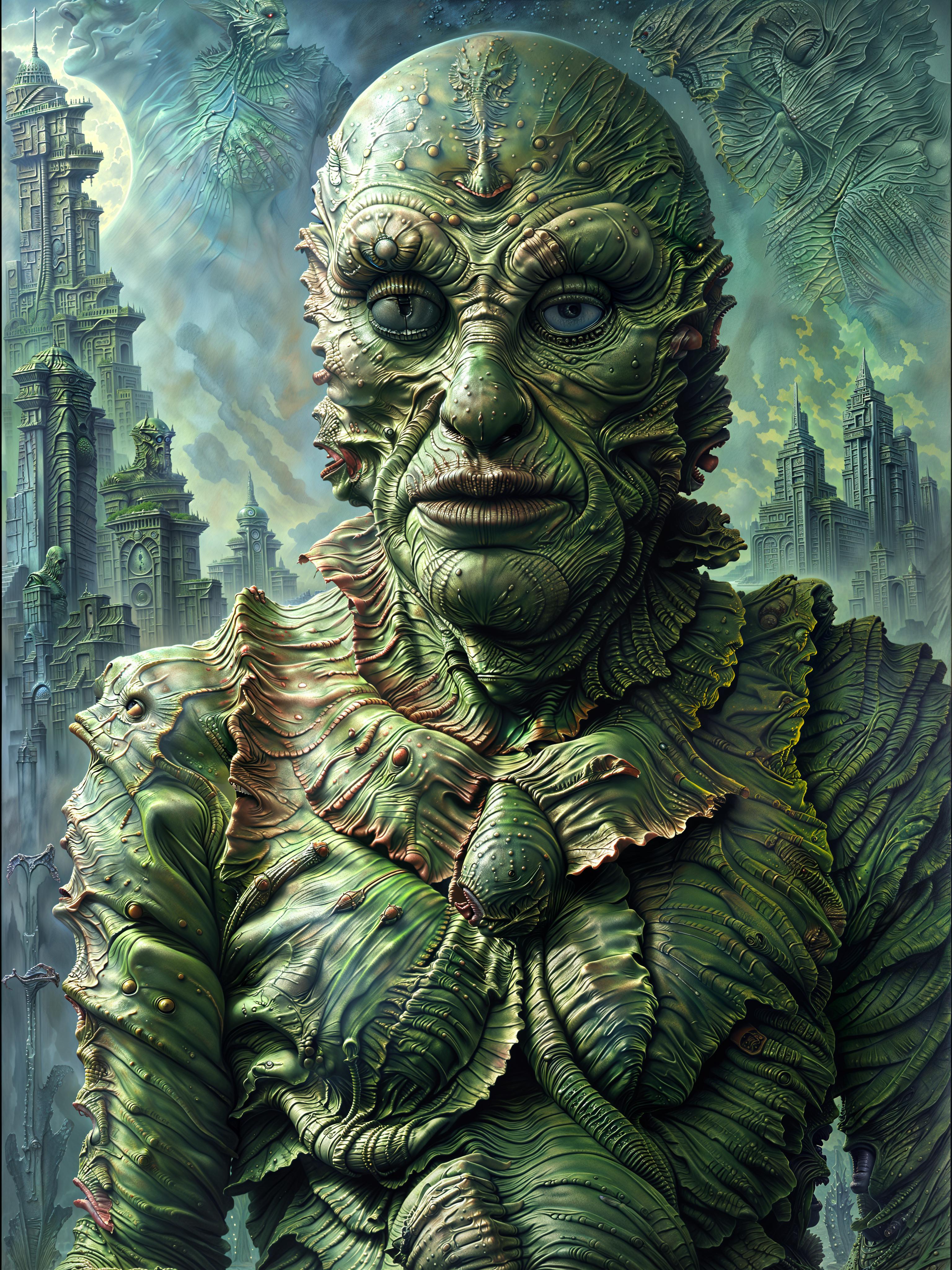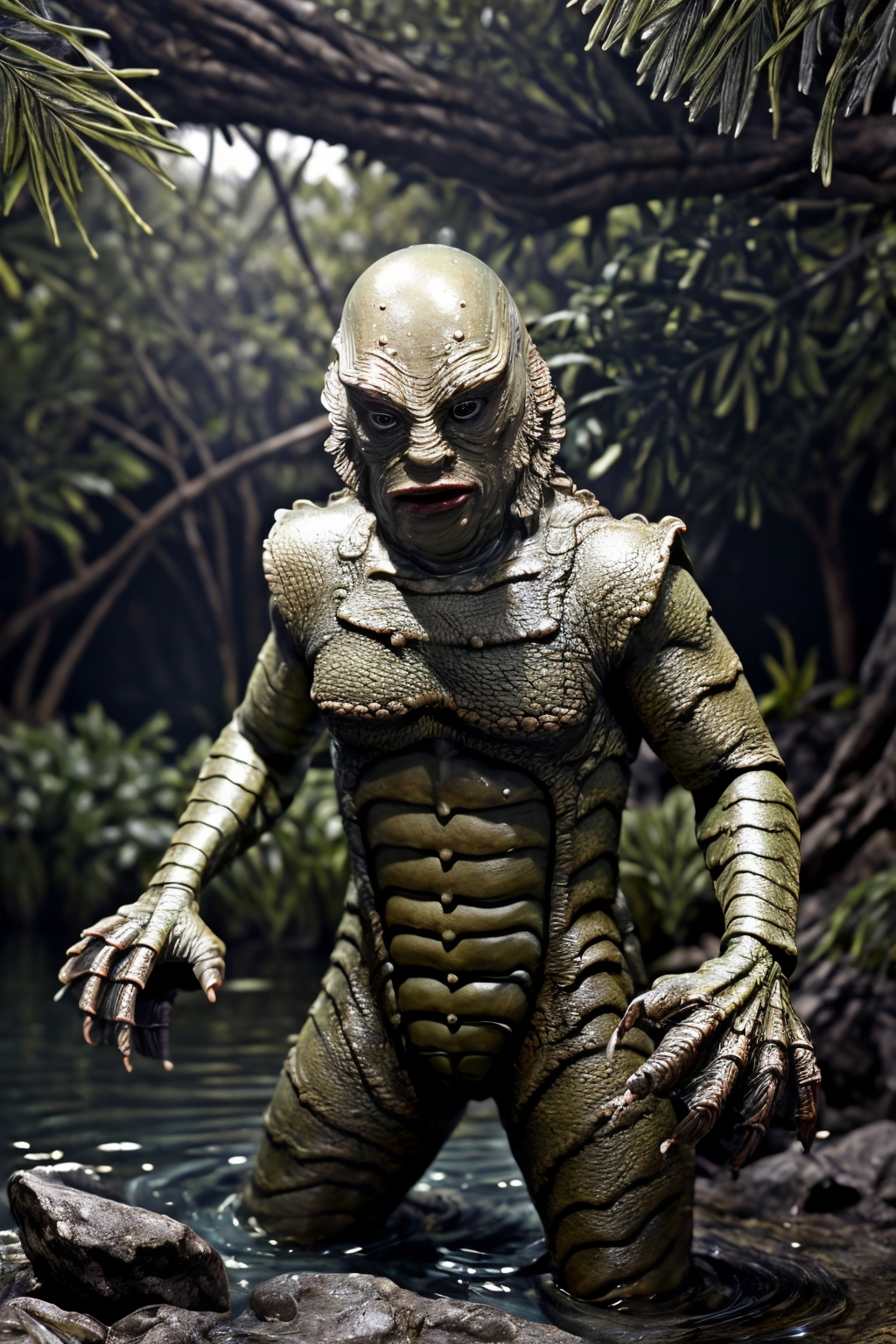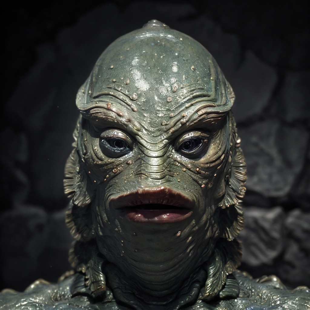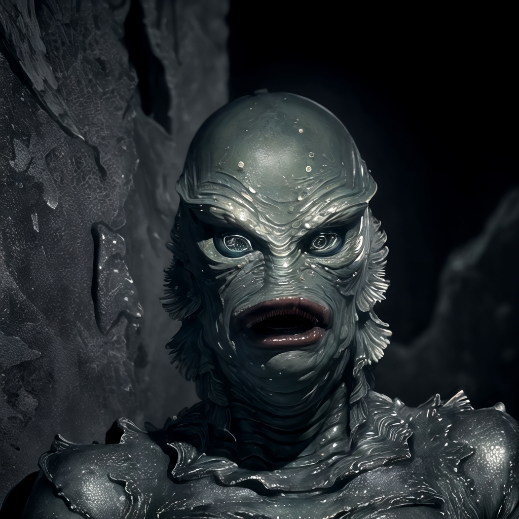 The Gill-man is the iconic creature from the 1954 film Creature from the Black Lagoon and its sequels. It is a fully amphibious monster with superhuman strength, webbed hands, and tough, scaly skin. The Gill-man is one of the Universal monsters and dwells in a remote lagoon in the Amazon Rainforest. Its encounter with a scientific expedition leads to a violent conflict, making it a memorable figure in the realm of classic monsters.