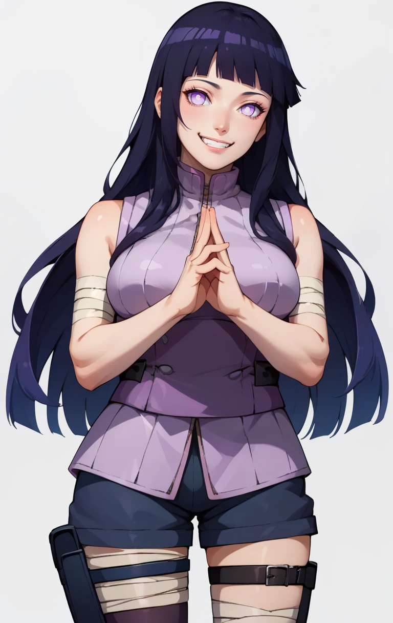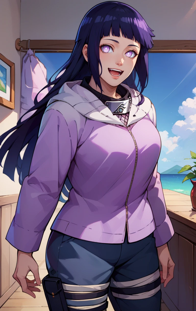 Promt: hinataSDXL, 1girl, solo, long hair, looking at viewer, smile, open mouth, room background, black hair, purple eyes, :d, pants, hood, hood down, white eyes, forehead protector, konohagakure symbol, hyuuga hinata,