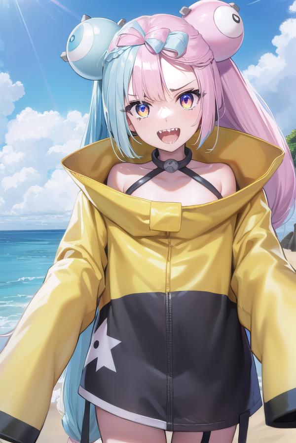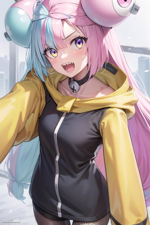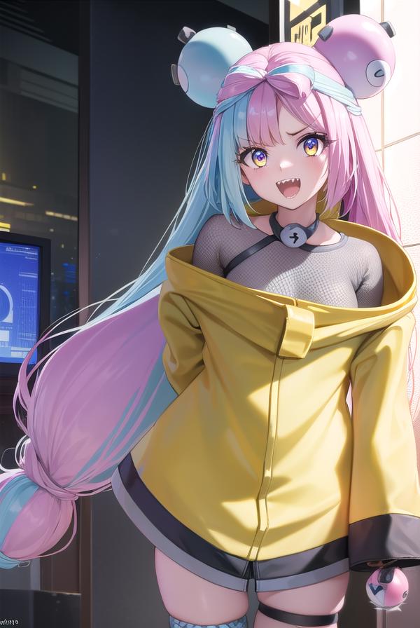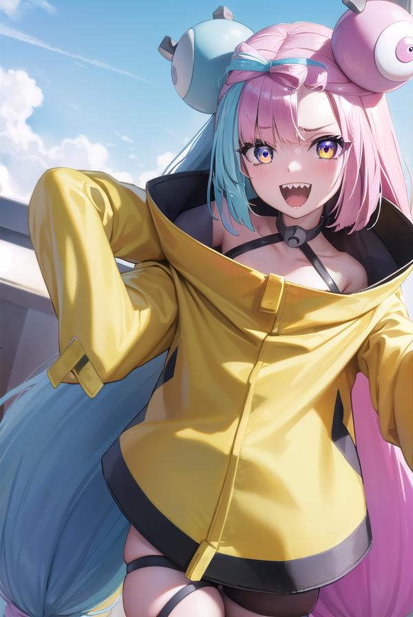 pokemon iono, blue hair, bow-shaped hair, character hair ornament, hair ornament, long hair, low-tied long hair, multicolored hair, pink hair, sharp teeth, split-color hair, twintails, two-tone hair, (pink eyes:1.5),