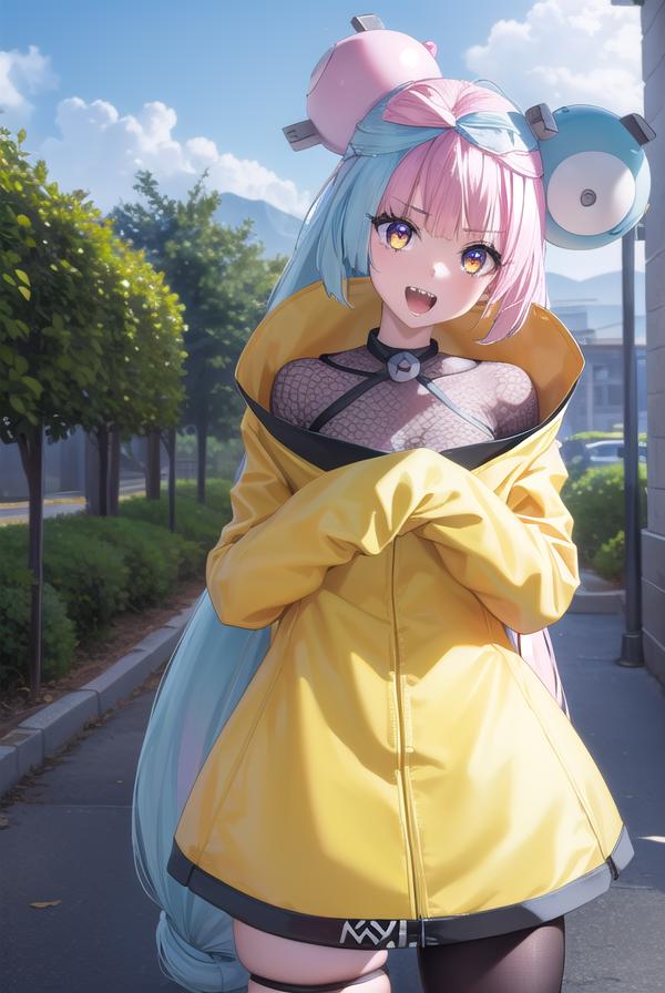 asymmetrical legwear, bell, bow-shaped hair, character hair ornament, hexagon print, oversized clothes, pantyhose, single leg pantyhose, split-color hair, jacket, (yellow jacket:1.5),