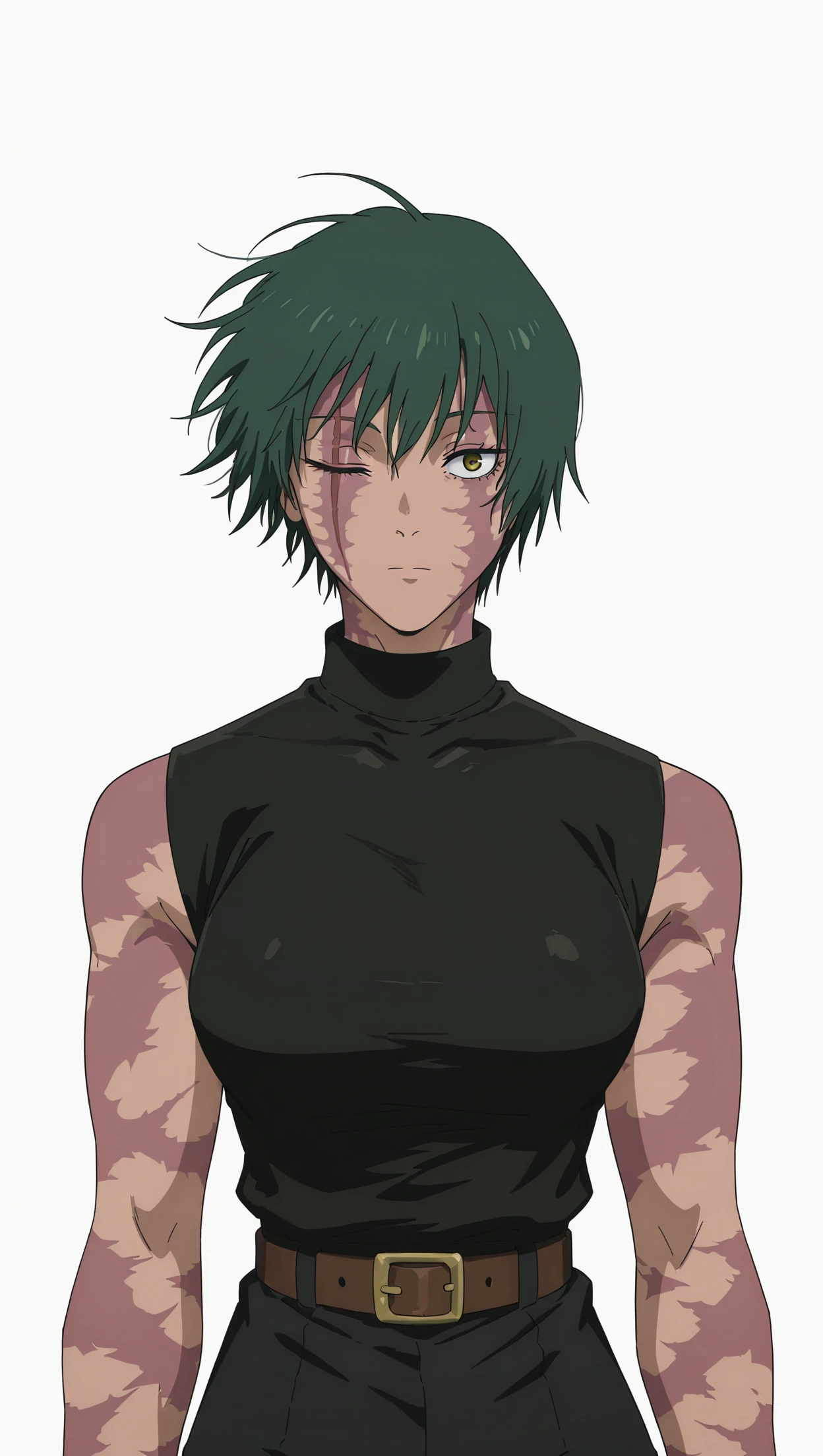 m4k1z3n1n, 1girl, short hair, green hair, one eye closed, scar across eye, shirt, black shirt, sleeveless, , shirt tucked it, belt, brown belt, pants, black pants