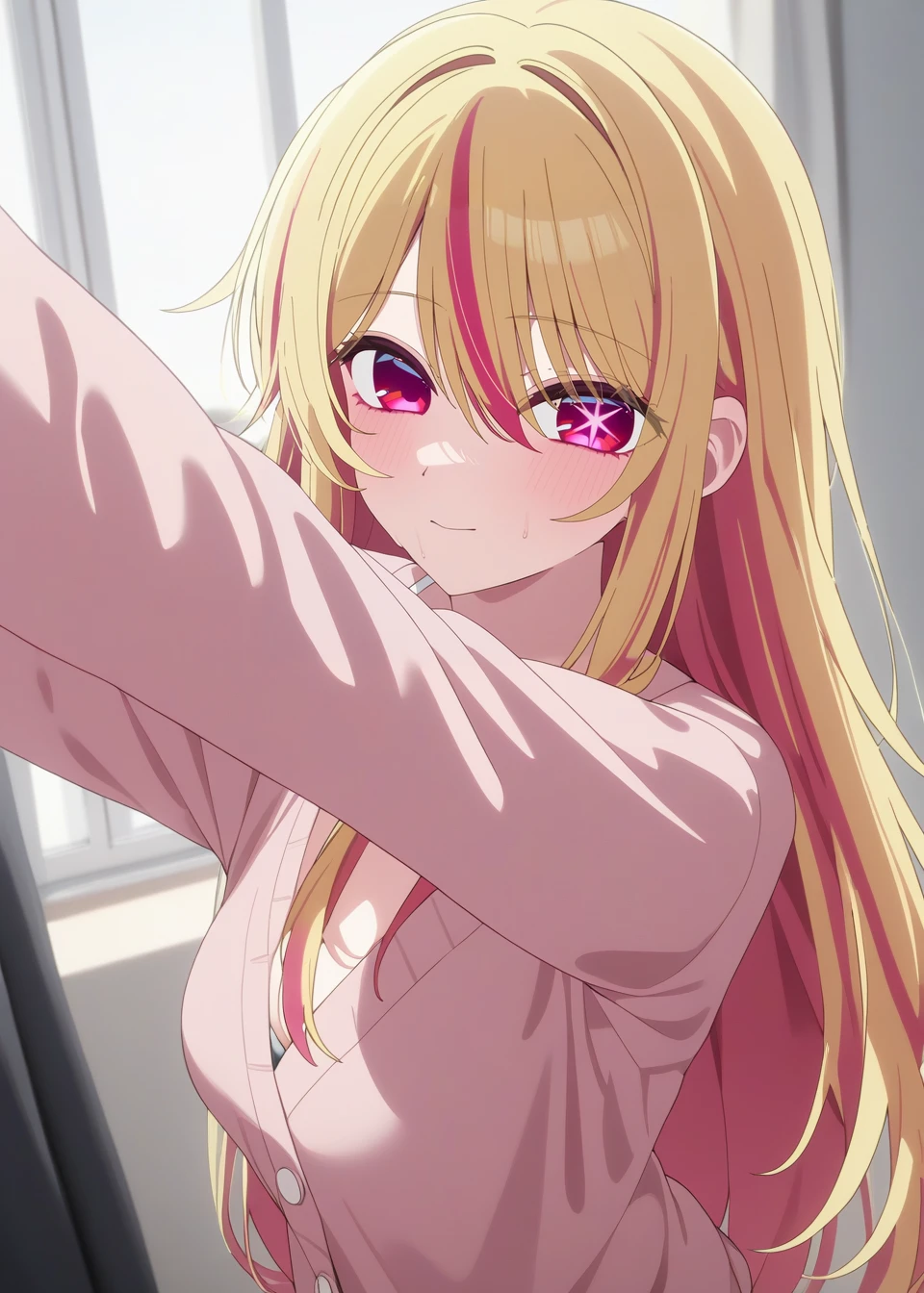 (ruby_hoshino, blonde hair, bangs, 1girl, pink eyes, long hair, looking at viewer, red eyes, streaked hair,hair between eyes)
