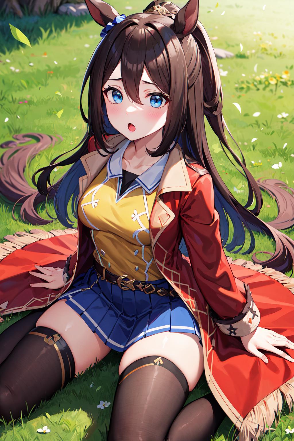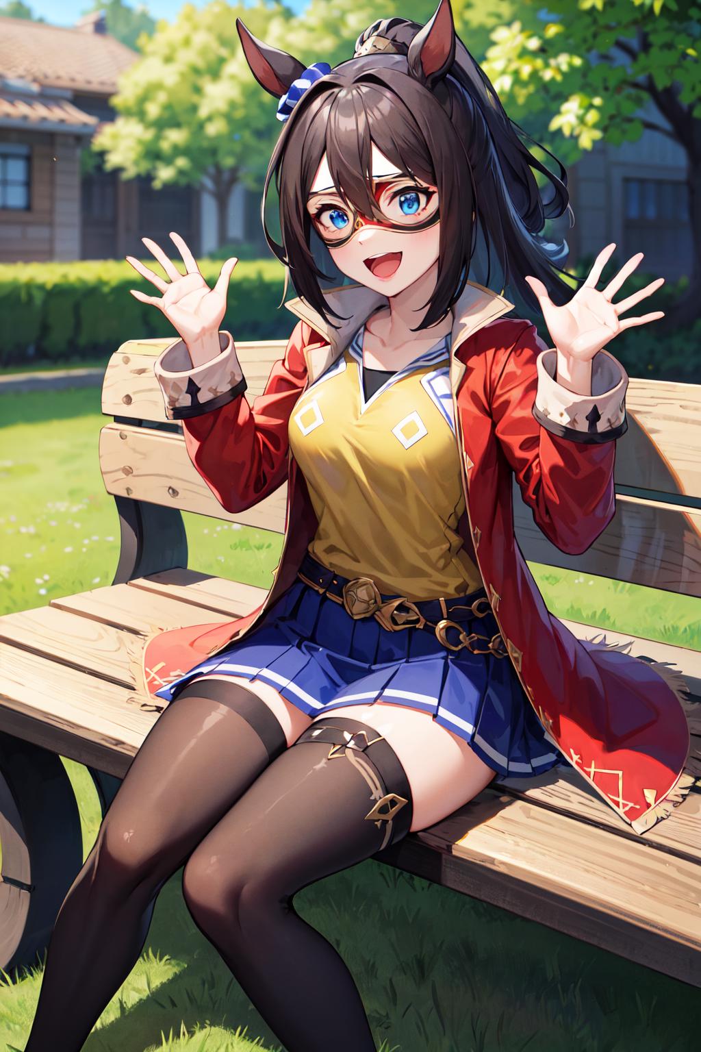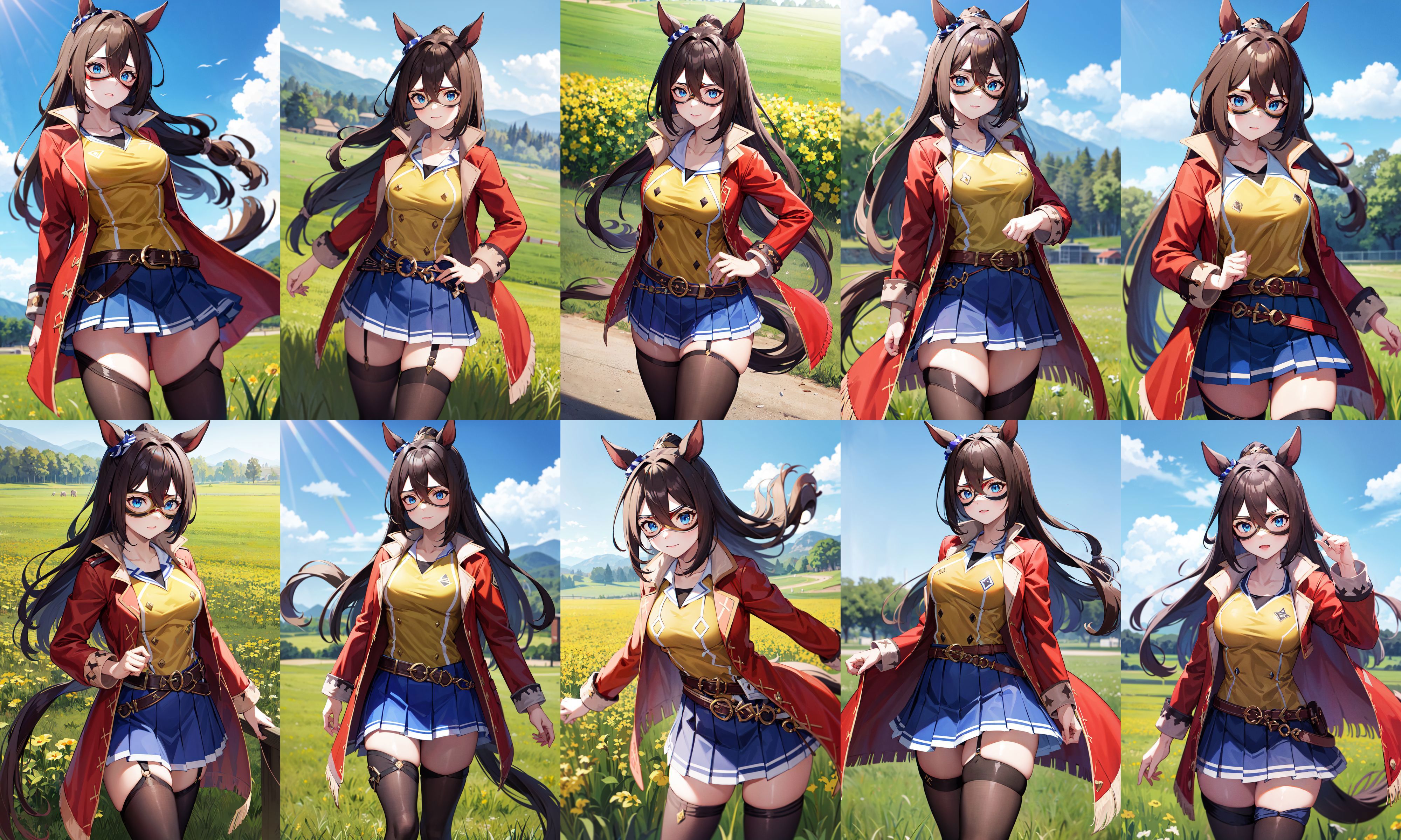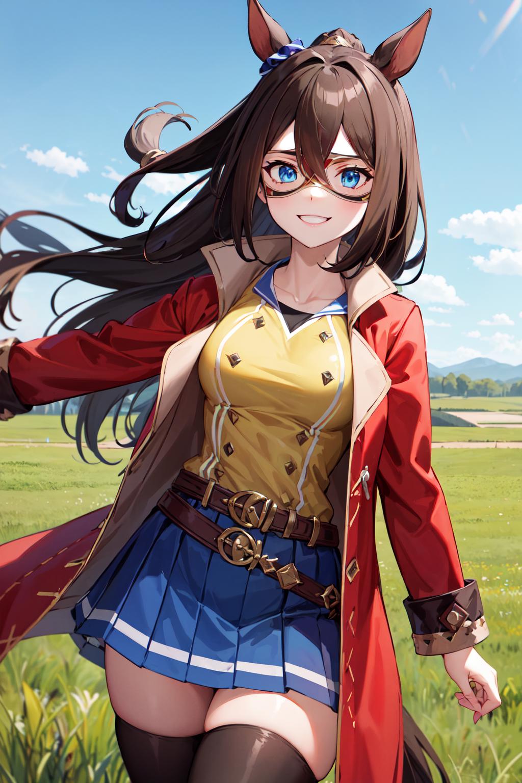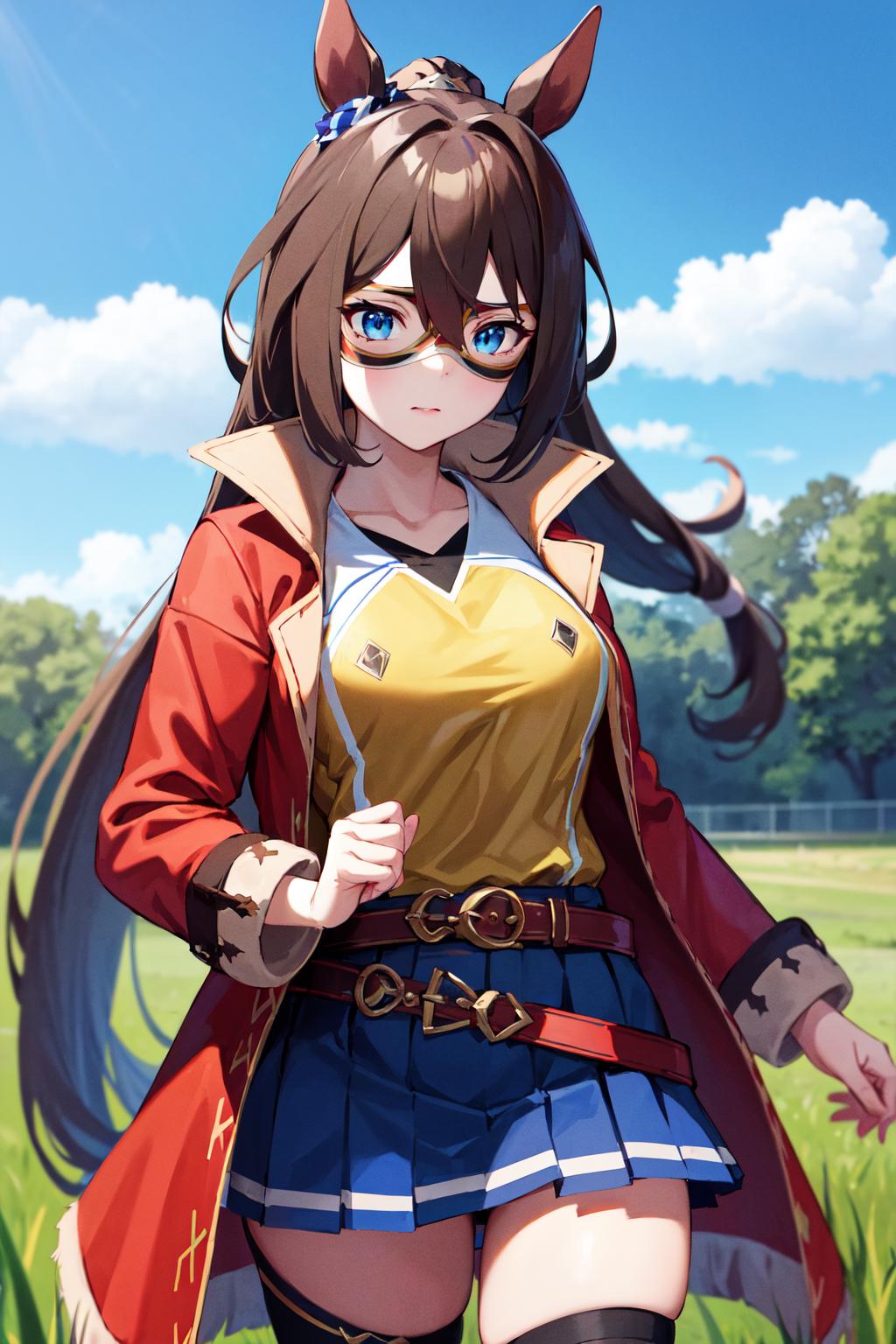 outfit1aaelcondor, blue eyes, animal ears, hair between eyes, domino mask, horse tail, yellow shirt, red coat, belt, blue skirt, pleated skirt, thighhighs
