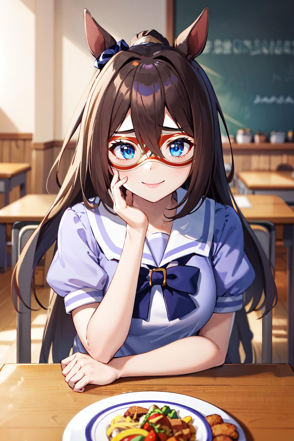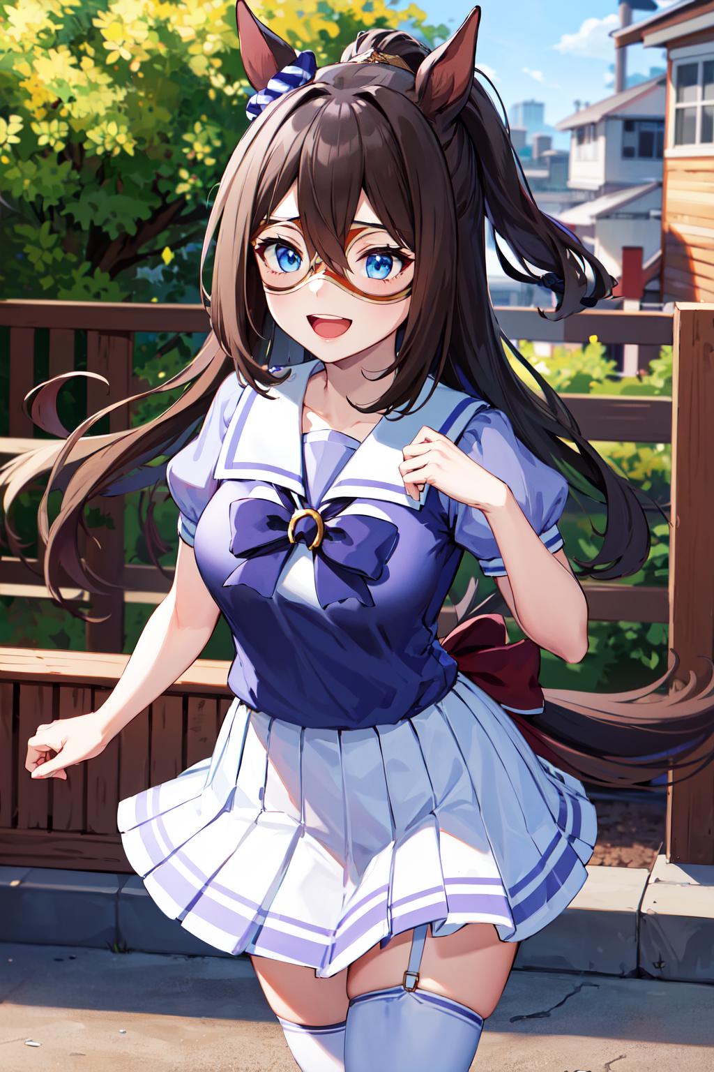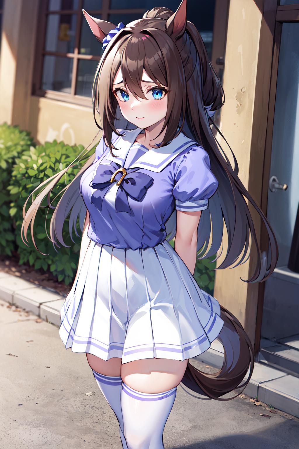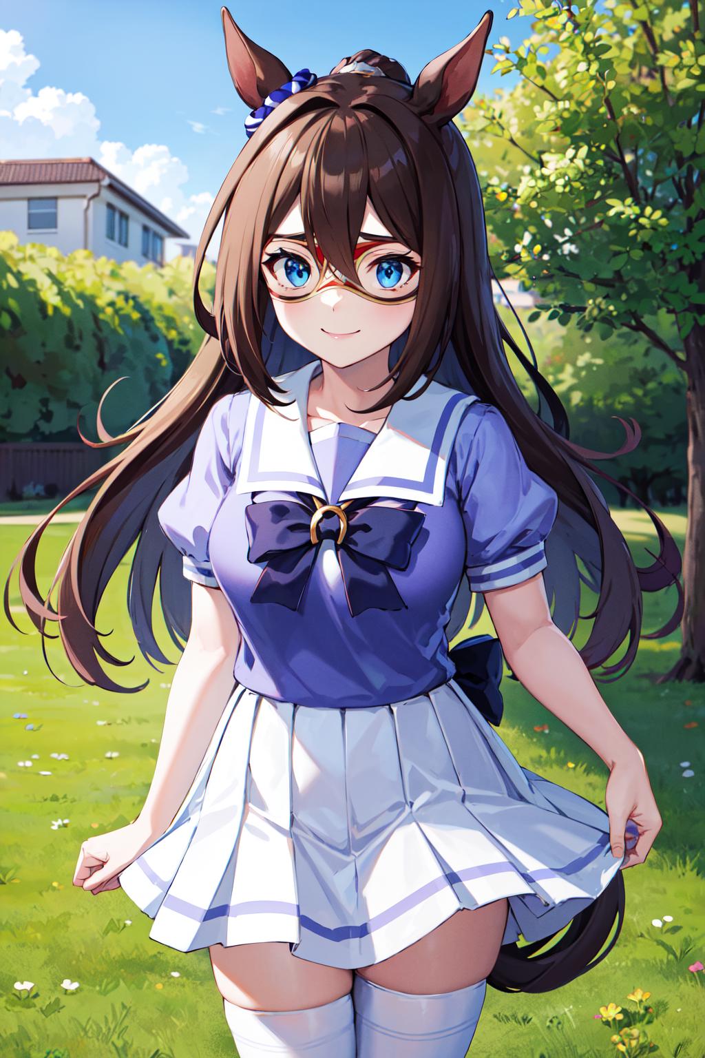 outfit2aaelcondor, blue eyes, animal ears, hair between eyes, domino mask, horse tail, school uniform, sailor collar, bowtie, sailor shirt, purple shirt, puffy sleeves, short sleeves, white skirt, white thighhighs
