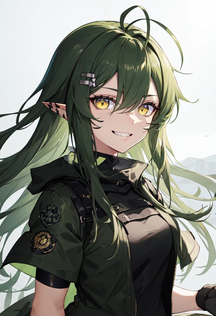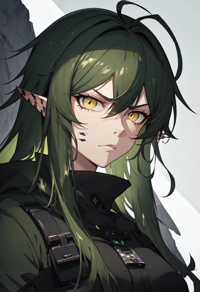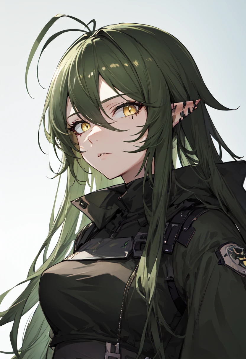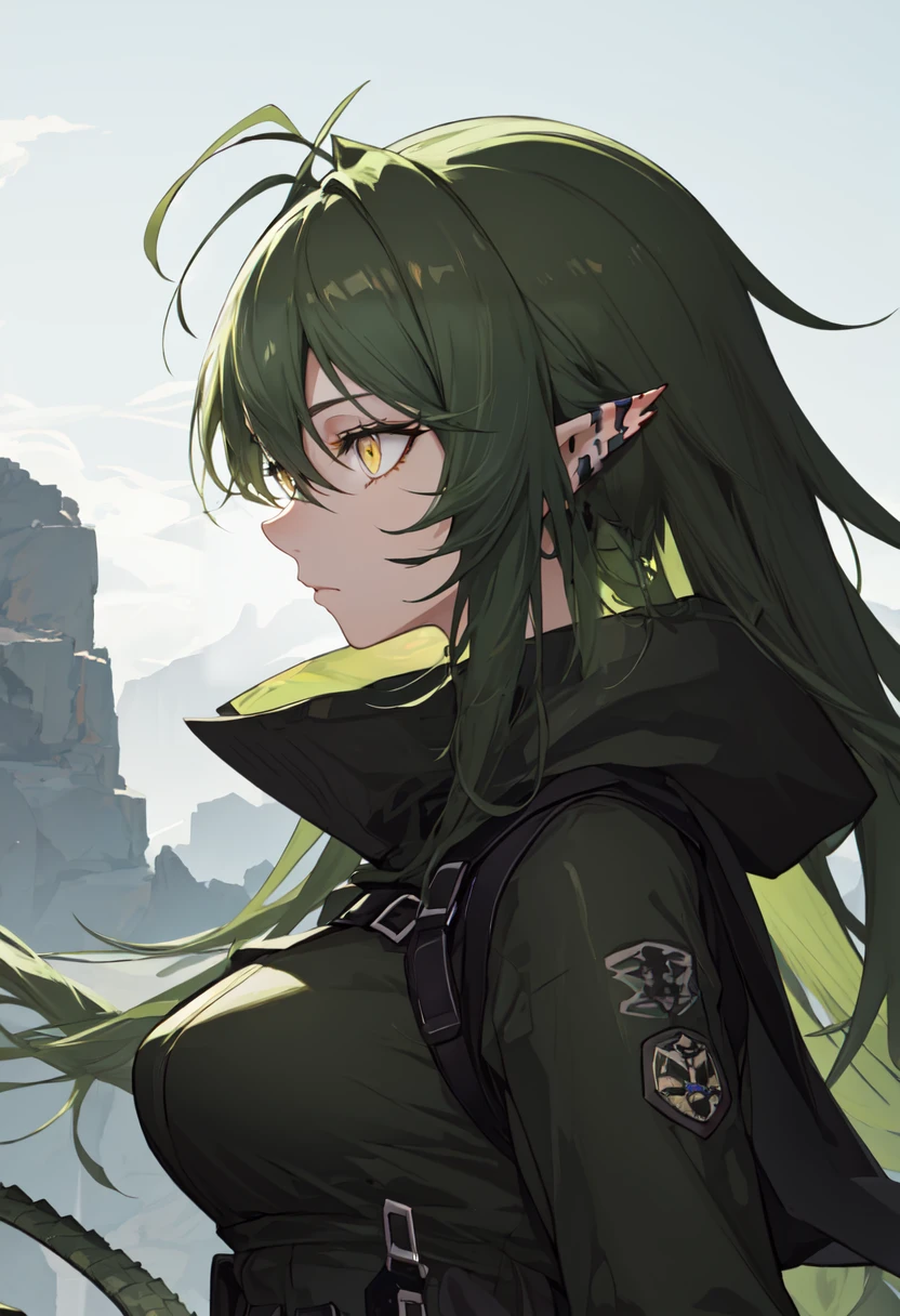 The trigger word is gavial_arknights, and the pruned tags are green_hair, long_hair, pointy_ears, yellow_eyes, ???????, crocodilian_tail, hair_between_eyes, tail, antenna_hair, ponytail, medium_breasts.