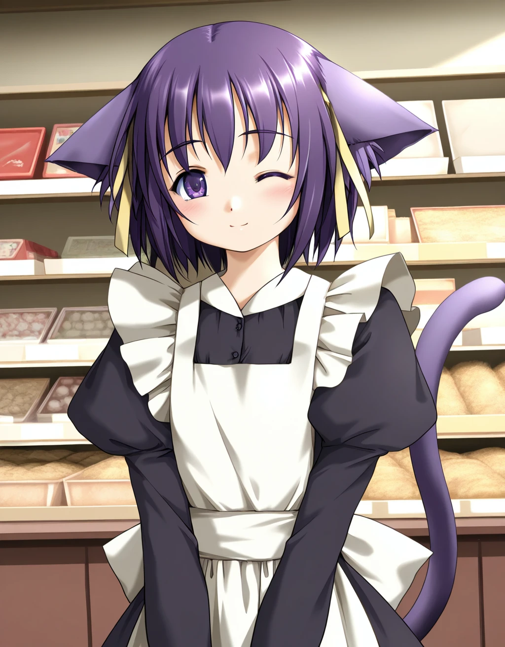 satsuki hapiburi, animal ears, cat tail, purple hair, purple eyes, hair ribbon,