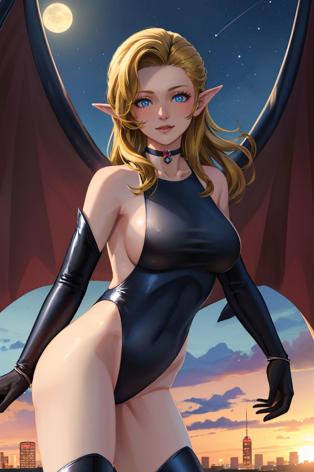 Tags: succubussmt, pointy ears, blonde hair, wings, elbow gloves, leotard, thigh boots, blue eyes, long hair, sideboob, choker