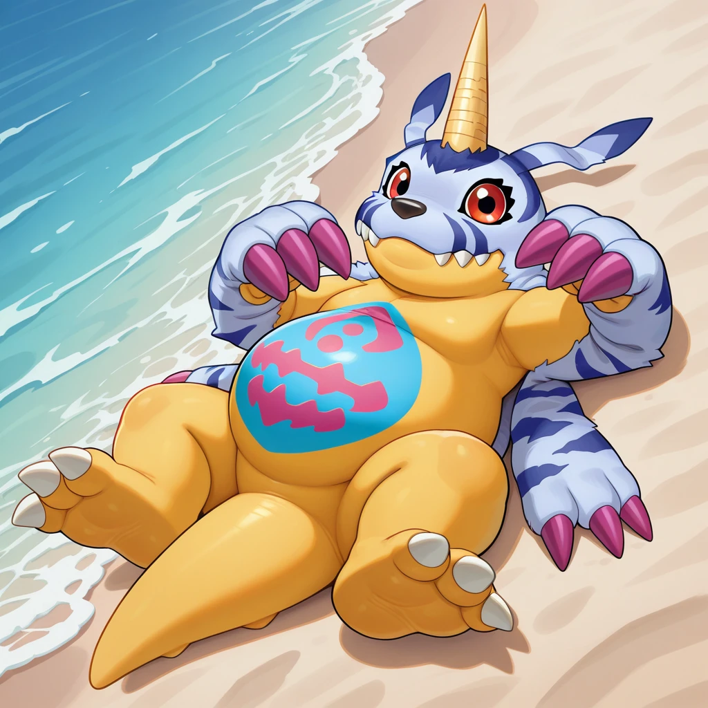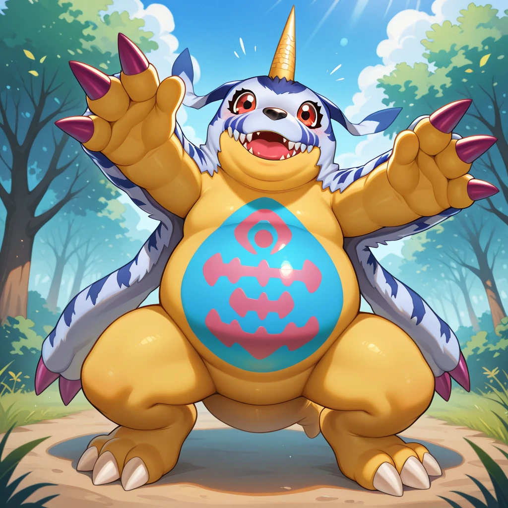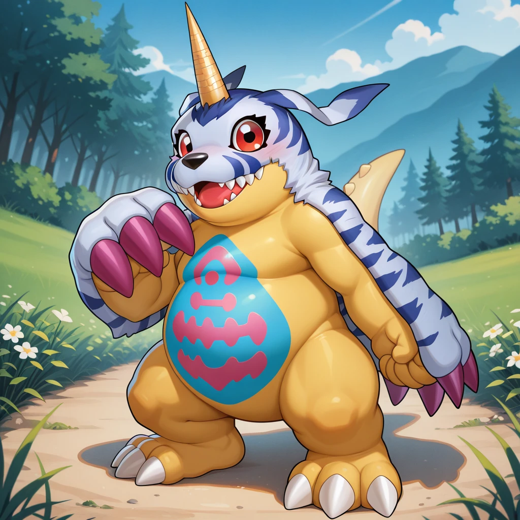 Best Positive Input: (gabumon, digimon, single horn, claws, red eyes, sharp teeth, creature, monster, chubby, pudgy belly, blue and pink markings on belly, blue fur pelt, yellow body, three toes)