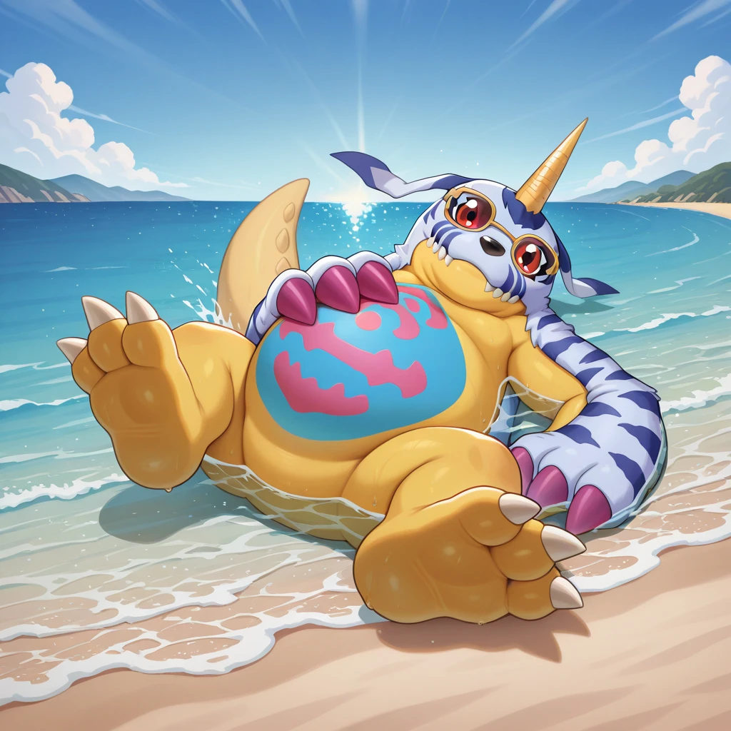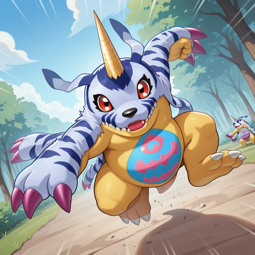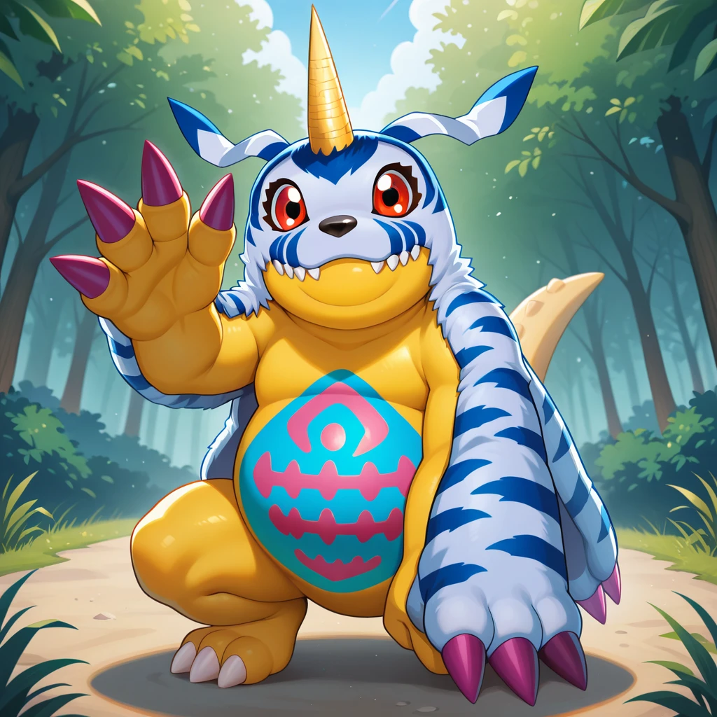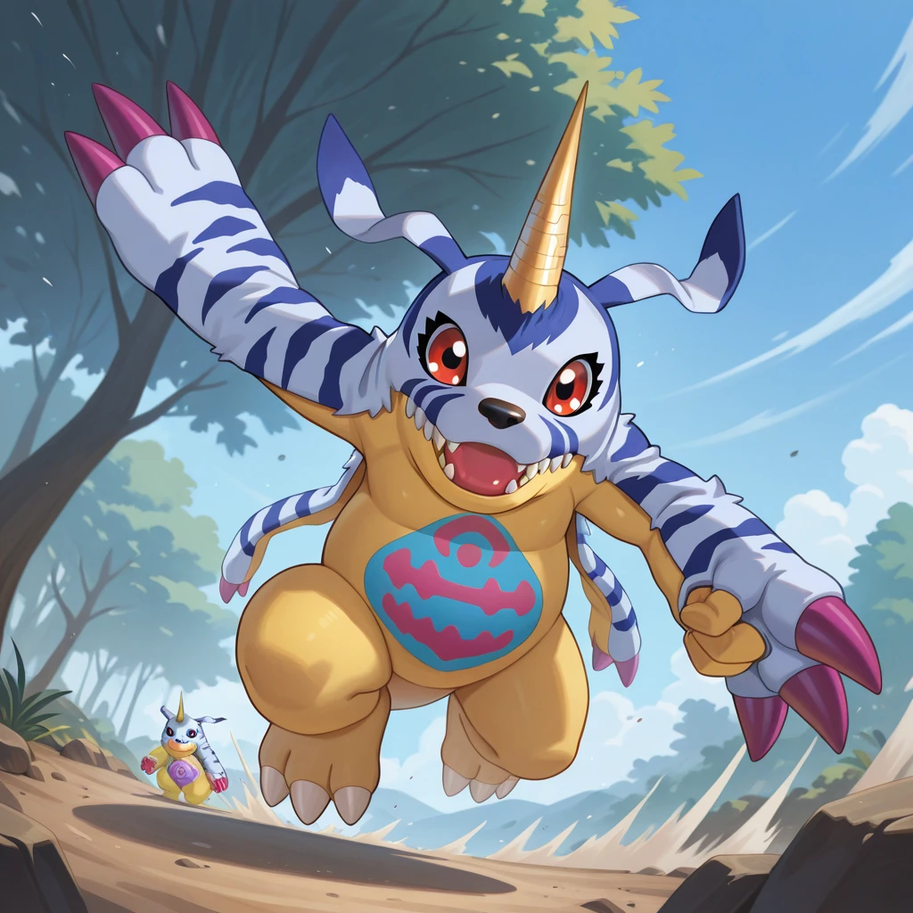 Best Positive Input: (gabumon, digimon, single horn, claws, red eyes, sharp teeth, creature, monster, chubby, pudgy belly, blue and pink markings on belly, blue fur pelt, yellow body, three toes)