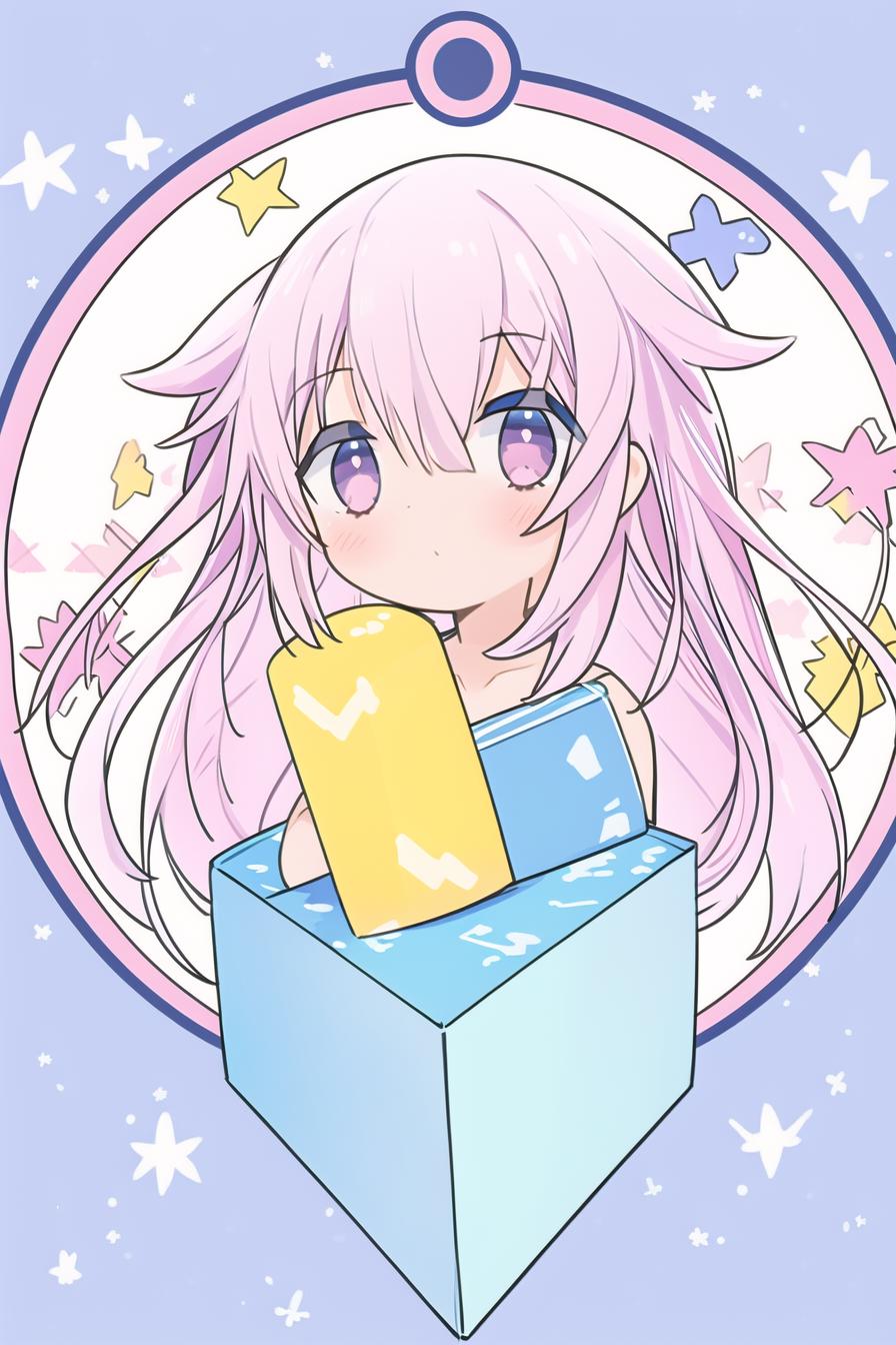 To summon her use the following tags: pikkyadultneptune, 1girl, long hair, solo, purple hair, purple eyes, looking at viewer, , smile, d-pad hair ornament, blush, jacket, cleavage, hood, choker