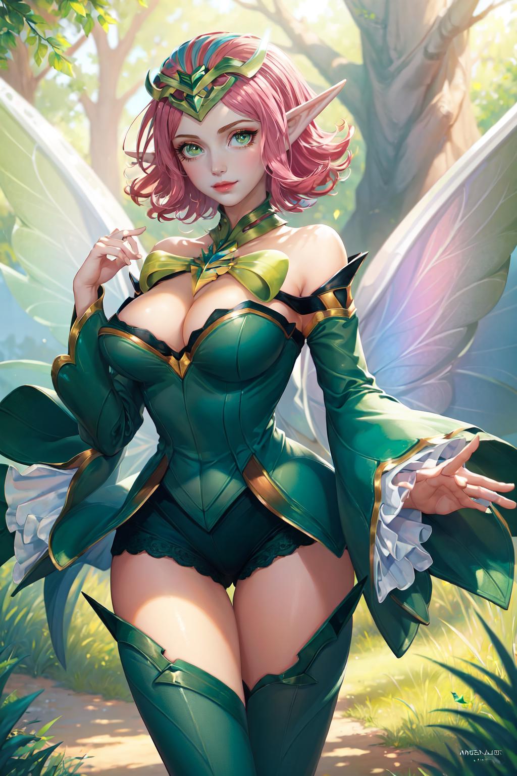 Prompt: ((???????????)), 1girl, solo, looking at viewer, smile, short hair, blue eyes, bow, holding, ???? shoulders, closed mouth, upper body, pink hair, pointy ears, bowtie, tiara, elf, green bow, green bowtie, ((butterfly wings)), 4 wings, ((forest)), magical light, iridescent, (( green glowing)), green clothes, elf, Glow Butterfly, Wonderland, flower castle, (flower)