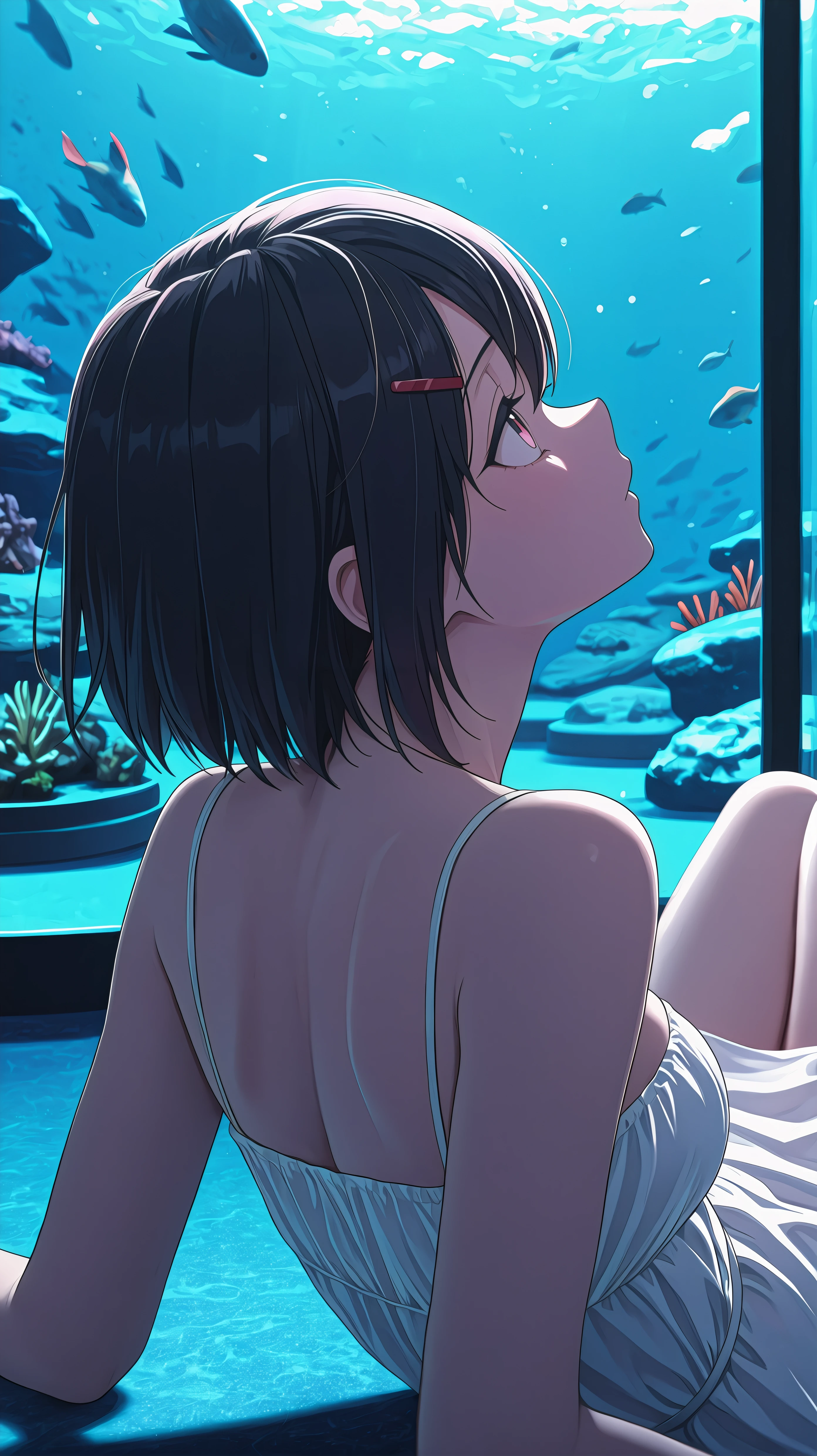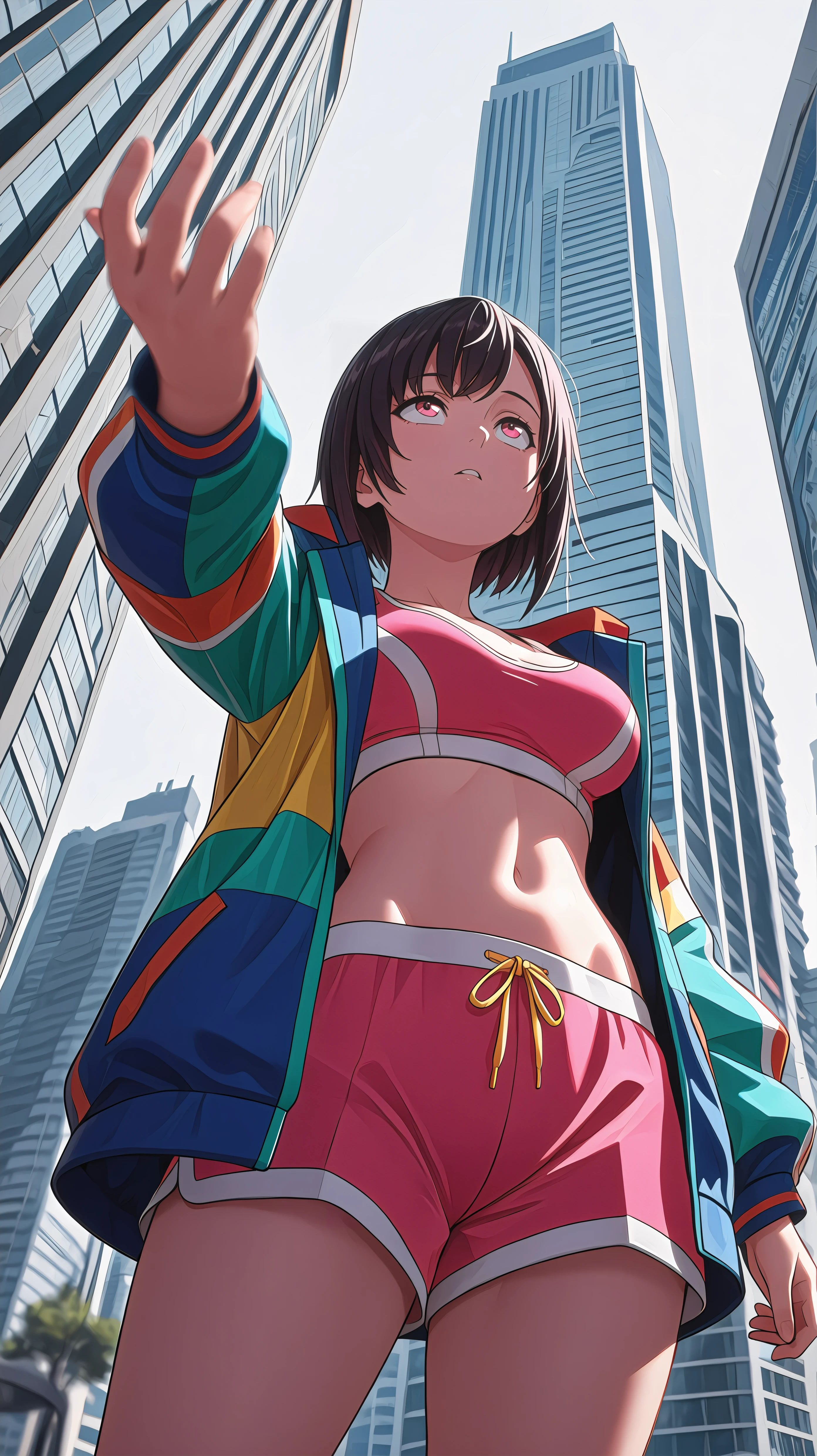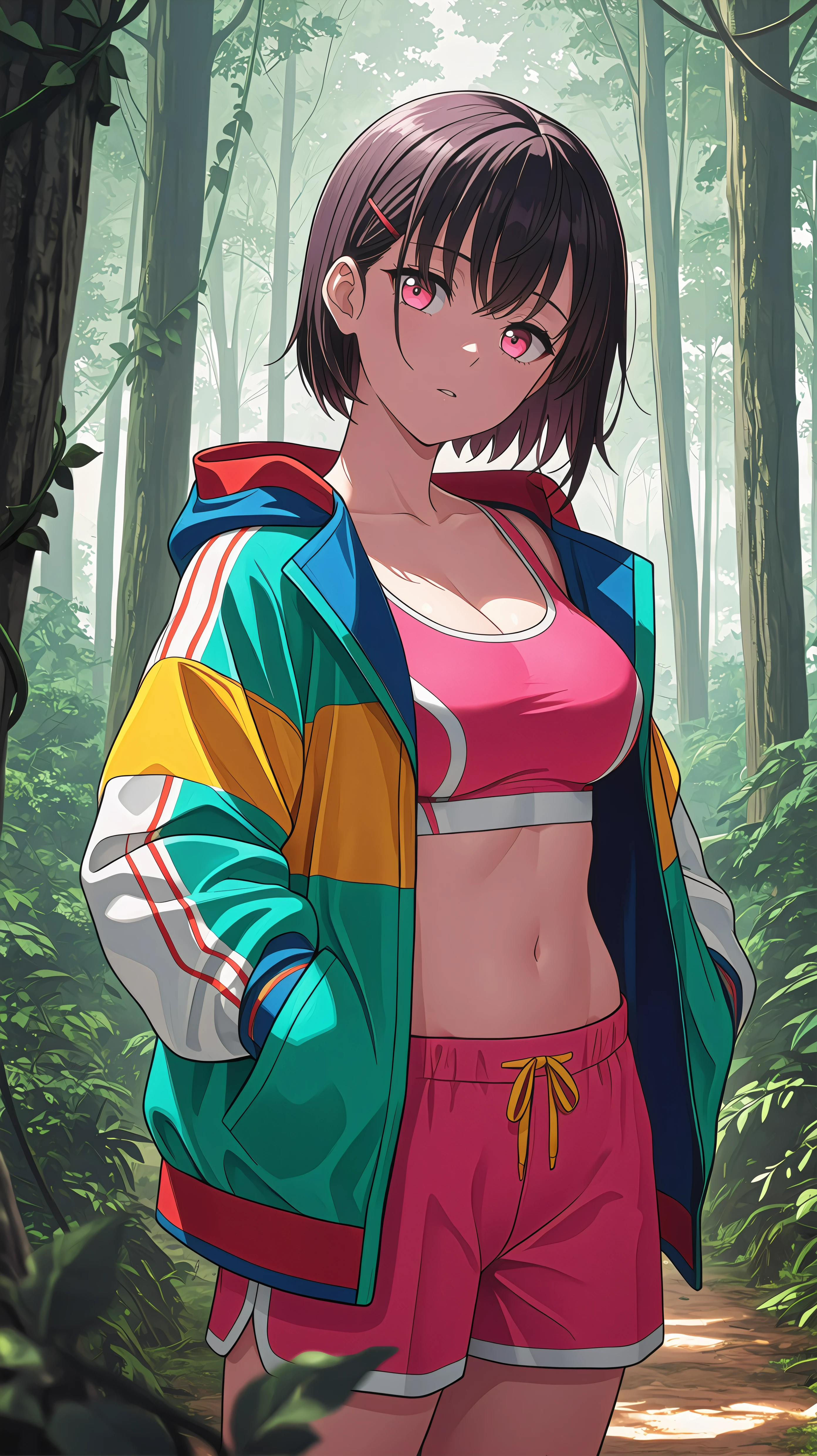short hair, black hair, pink eyes, pink sports bra, pink shorts, colorful blue jacket, oversized jacket, hairclip, bangs