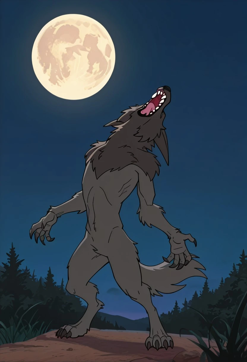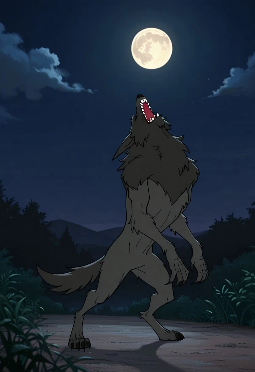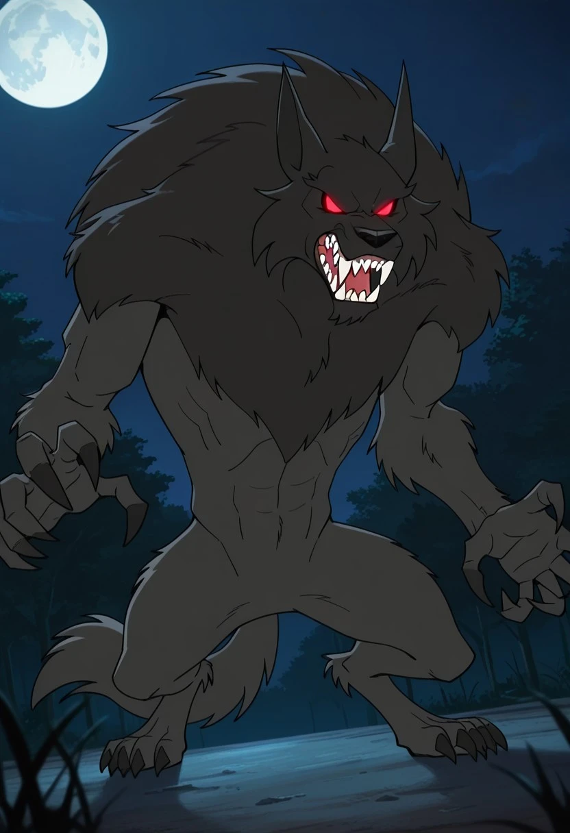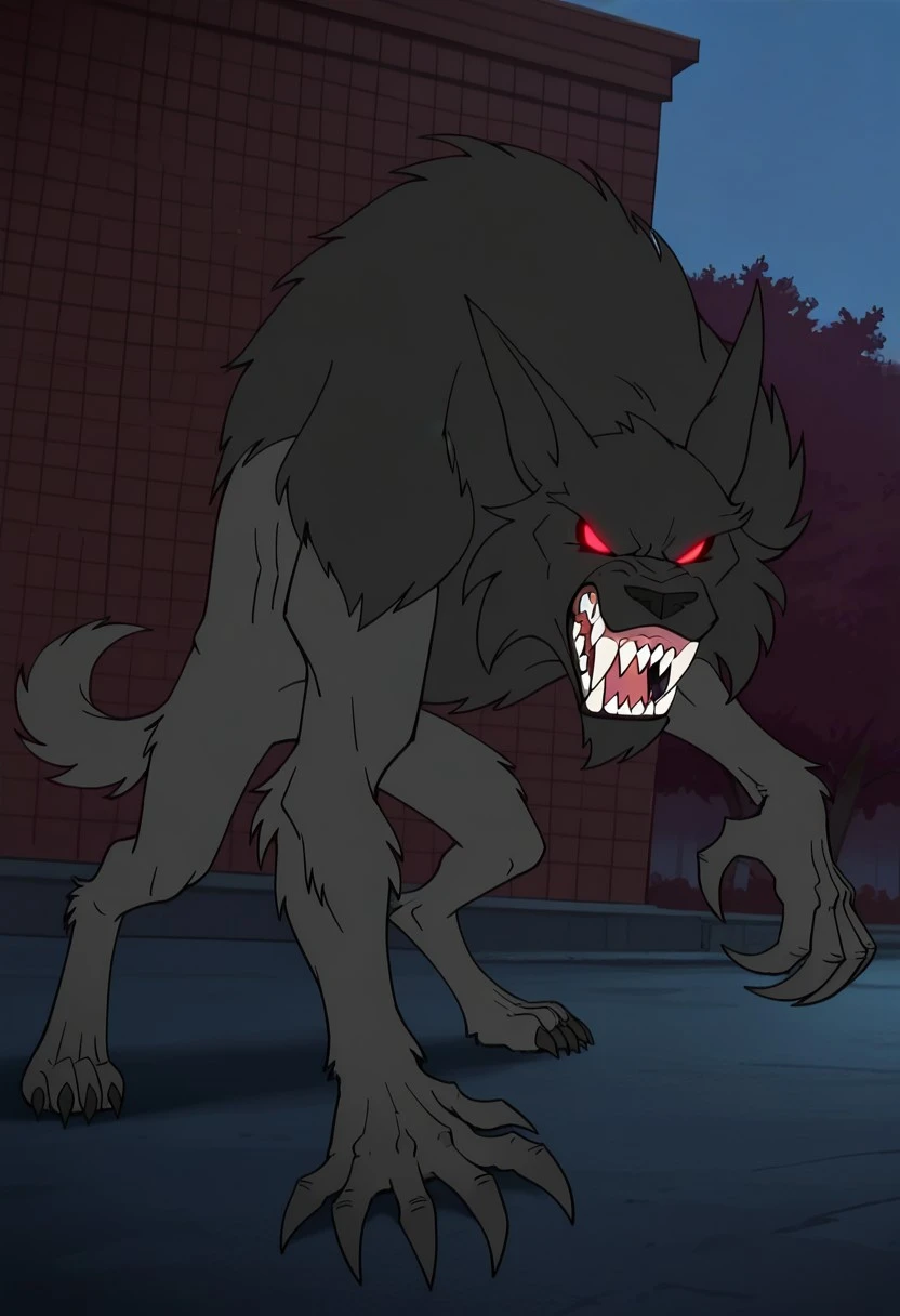 WW-BCSD, dark grey upper fur, grey bottom fur, long pointed ears, red eyes, sharp teeth, claws, tail