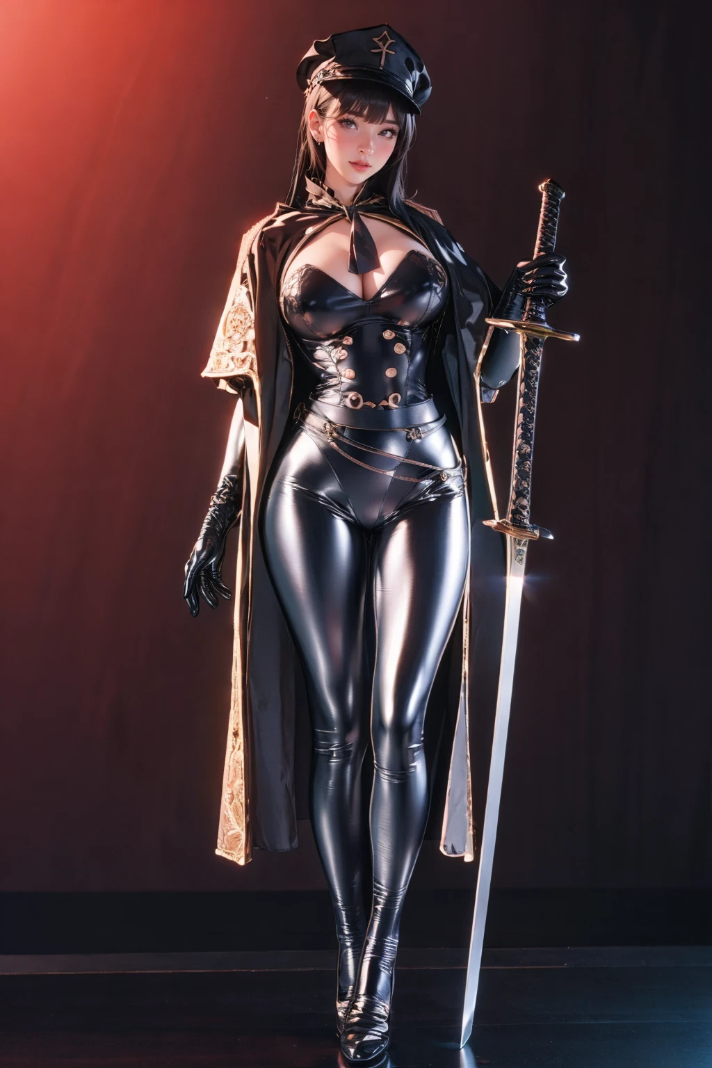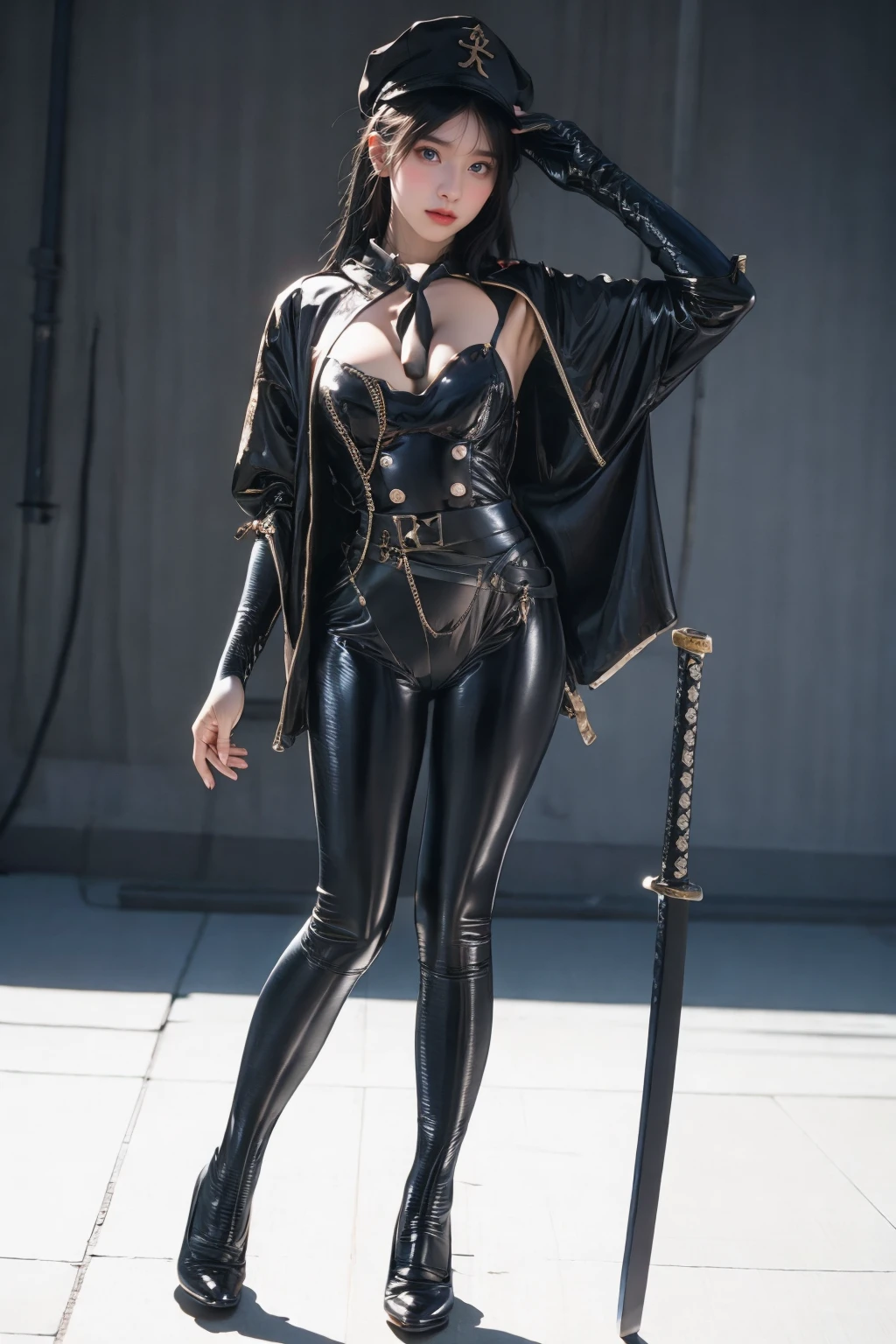 Prompt words: ruanyi0110,hat,katana,zipper,bdsm,dominatrix,black bodysuit,boots,