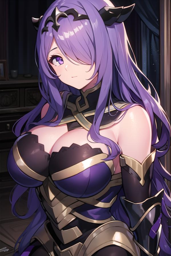 camilla, (hair over one eye:1.5), long hair, (purple eyes:1.1), purple hair, wavy hair,
