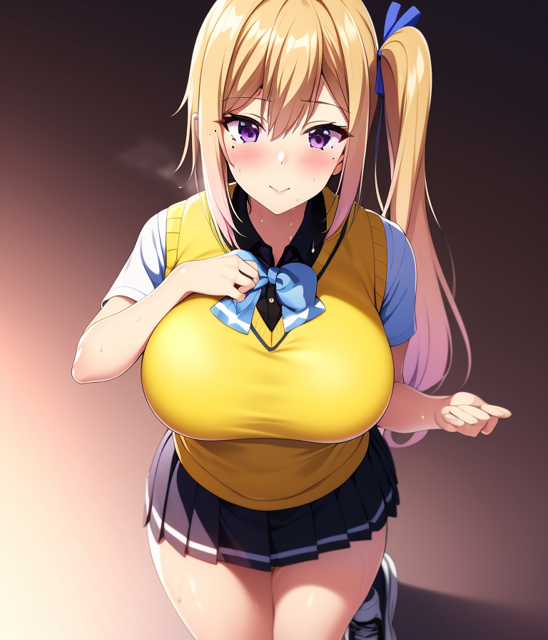 Optional tags for base appearance: blonde hair, side ponytail, purple eyes, long hair, bangs, gradient hair, mole, ?????????????, school uniform, black shirt, sweater vest, pleated skirt, sneakers, black socks,