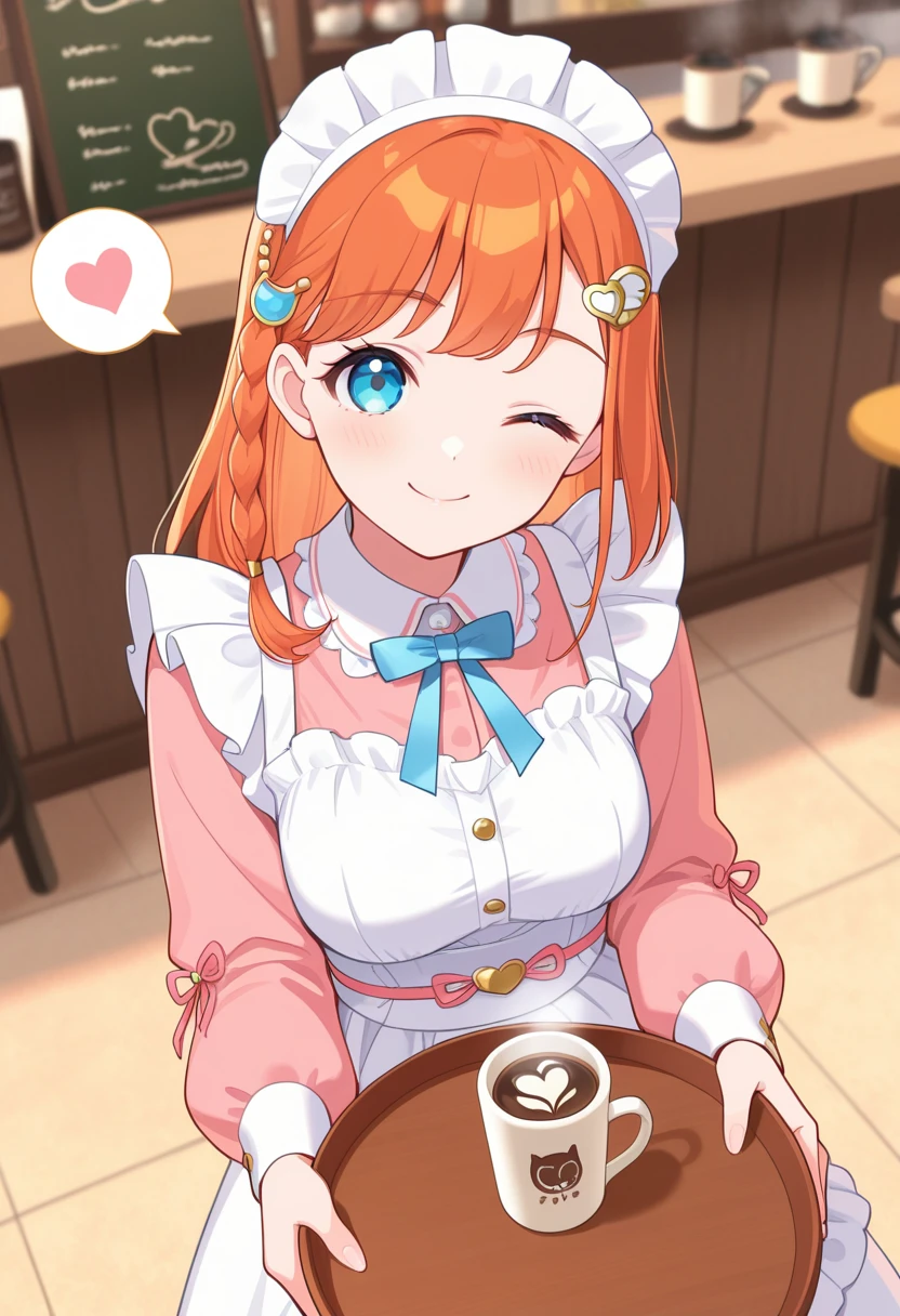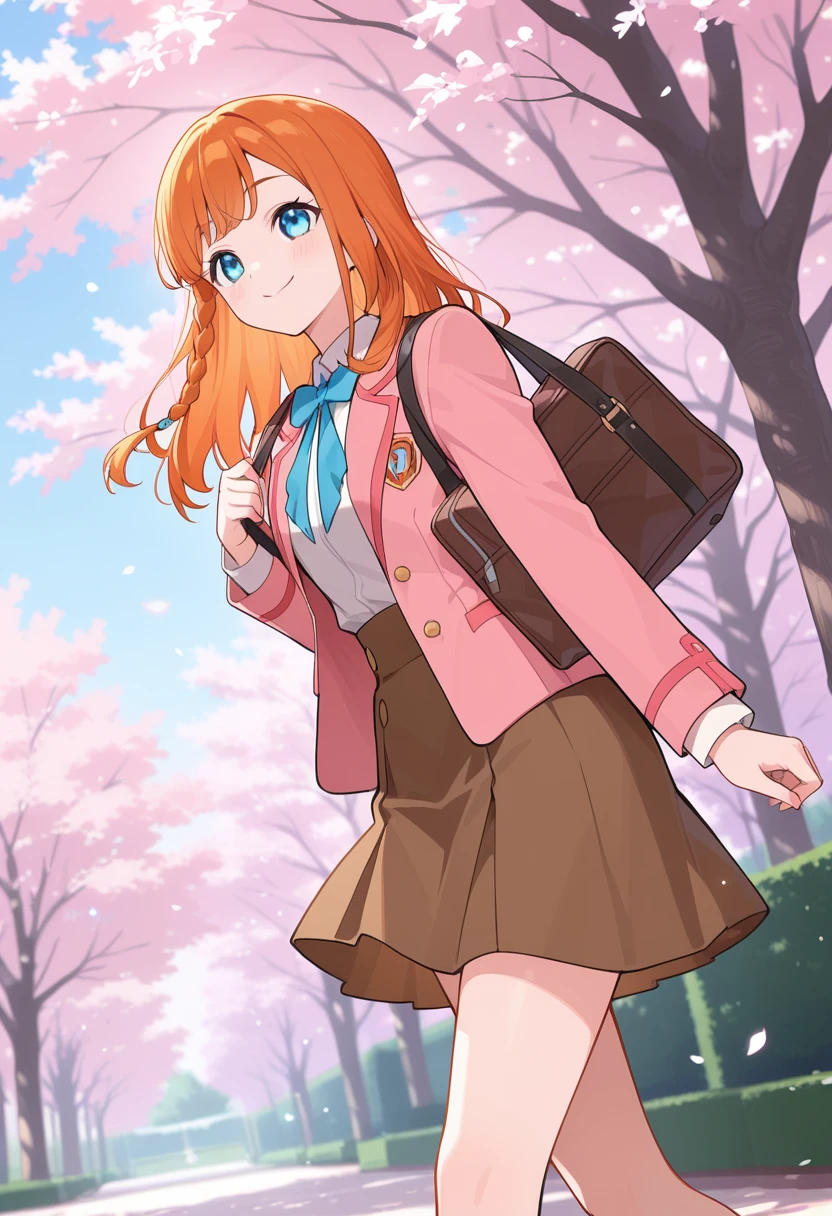 school uniform: matsurischo, blue eyes, accessory, hair accessory, school uniform, braided hair, orange hair, brown skirt, pink jacket,
